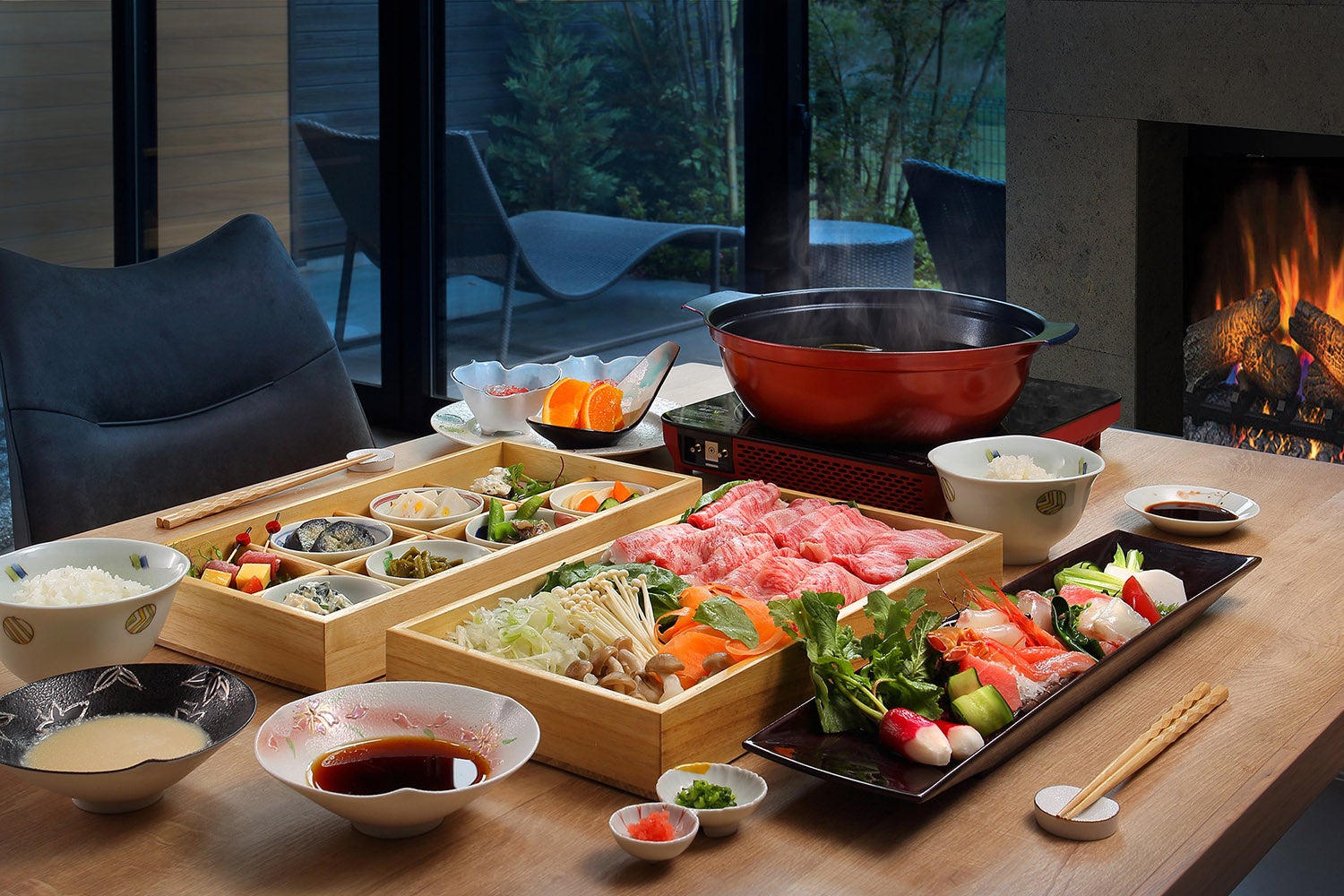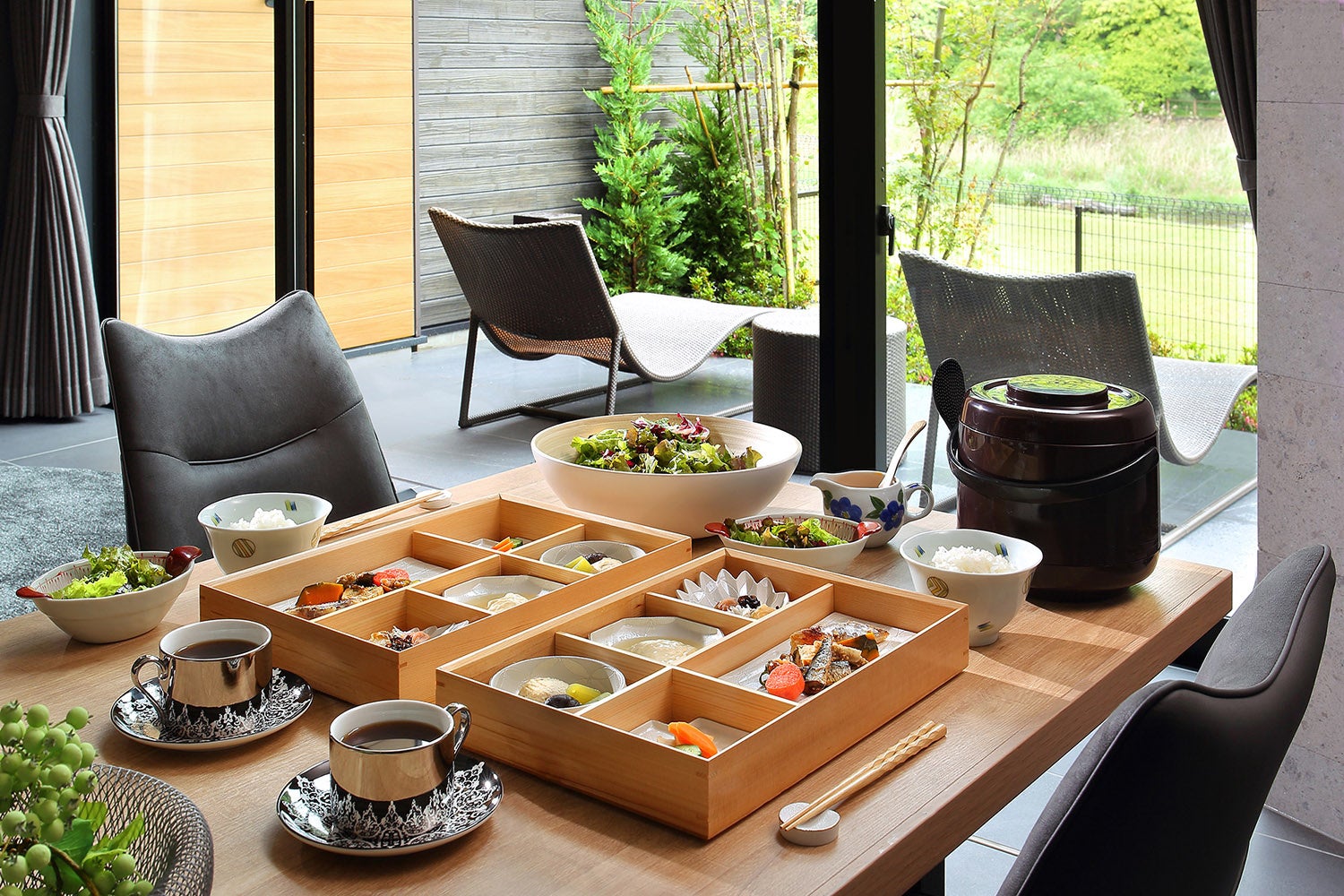 ご朝食はご指定の時間に、地元の素材を主体に季節の旬味を盛り込んだ和食の味わいお重「KUREHA-CO膳」をヴィラ毎に設置した専用配膳口まで、スタッフがお持ちいたします。慌ただしいお宿の朝と無縁のご朝食をヴィラ内にご用意したダイニングや星見テラスなど、お好きな場所でピクニック感覚でお楽しみください。