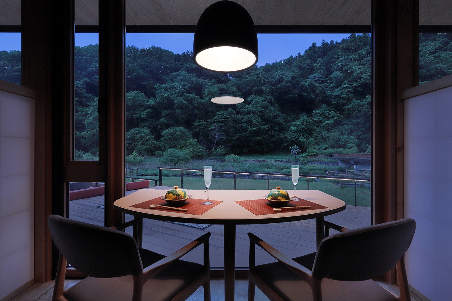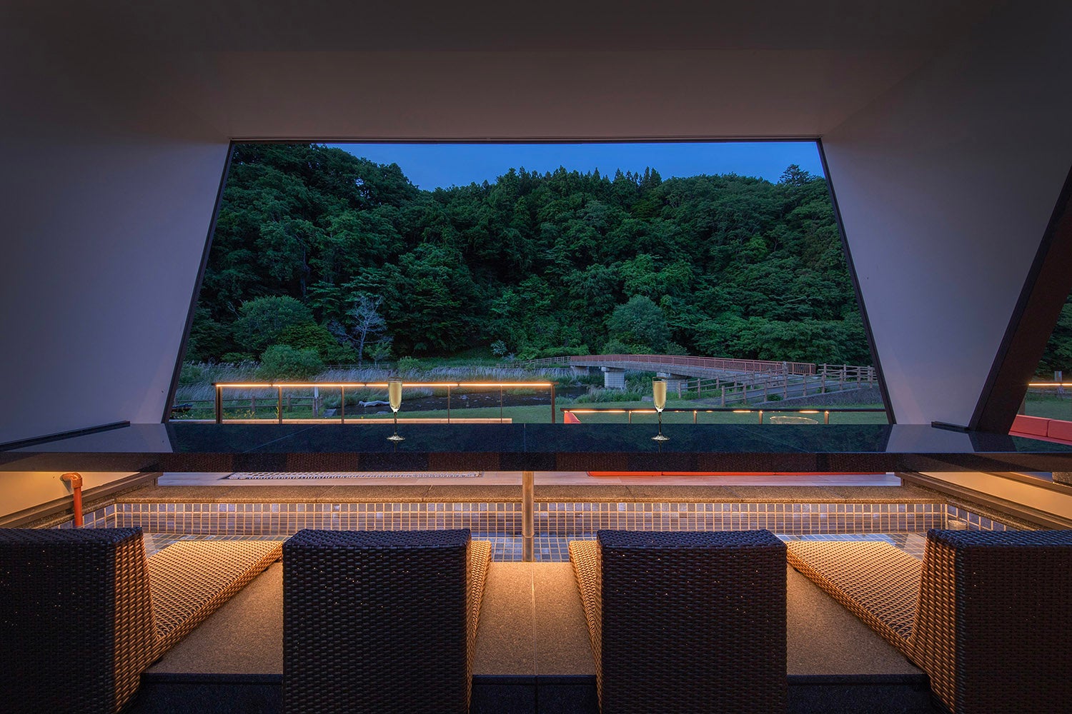 解放感も満点のリバーサイドテラスは、間接照明が灯る夕暮れからは昼間の雰囲気とはまた異なるムードあふれるナイトサロンに。お⾷事前やお⾷事後のひととき、焚⽕台を囲むソファーにゆったりと⾝を沈め、お酒を⽚⼿に語らいを楽しむスポットとしてもお楽しみください。⾜湯テラスはダイニングをご利⽤されないお客様も自由にお楽しみいただけます。