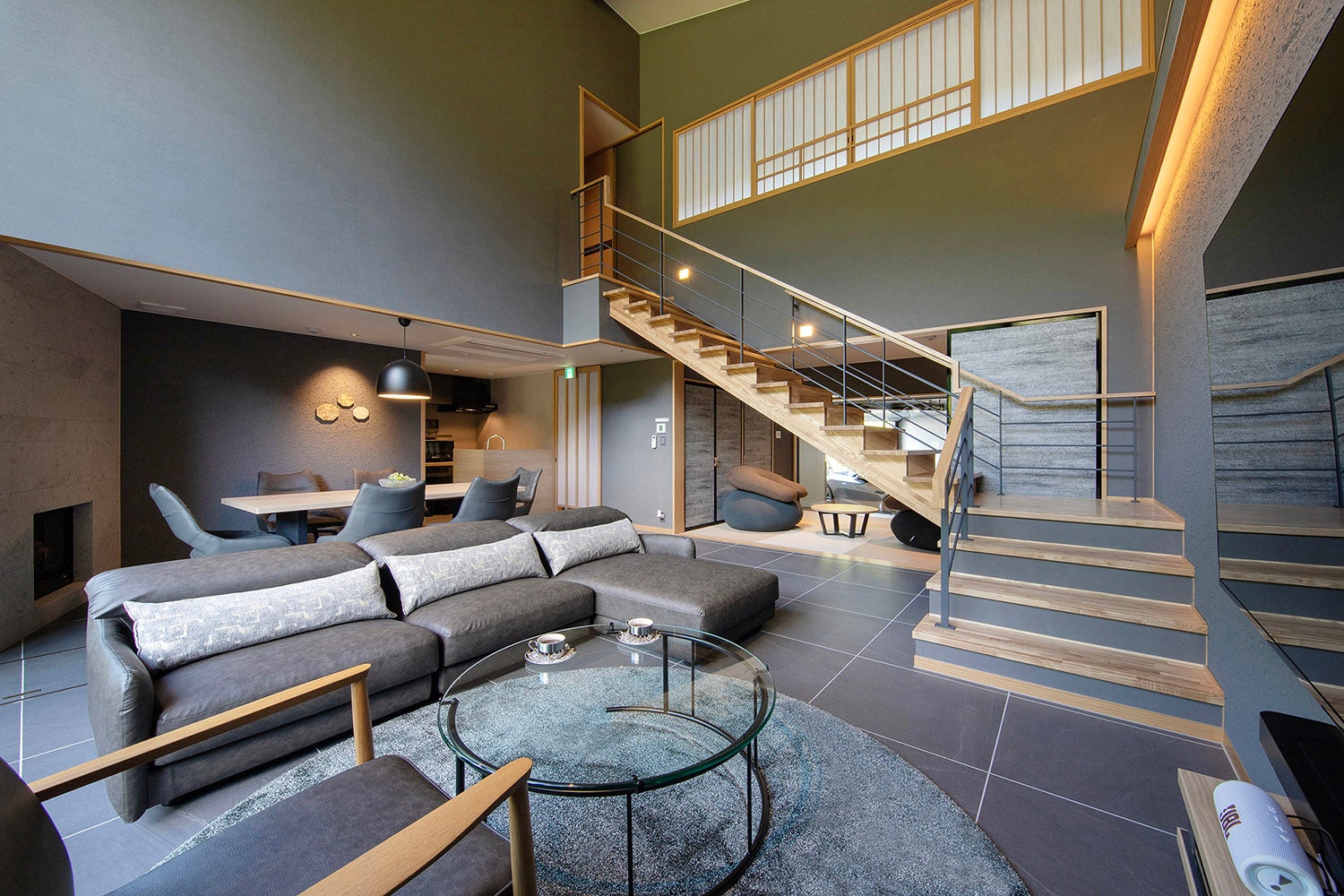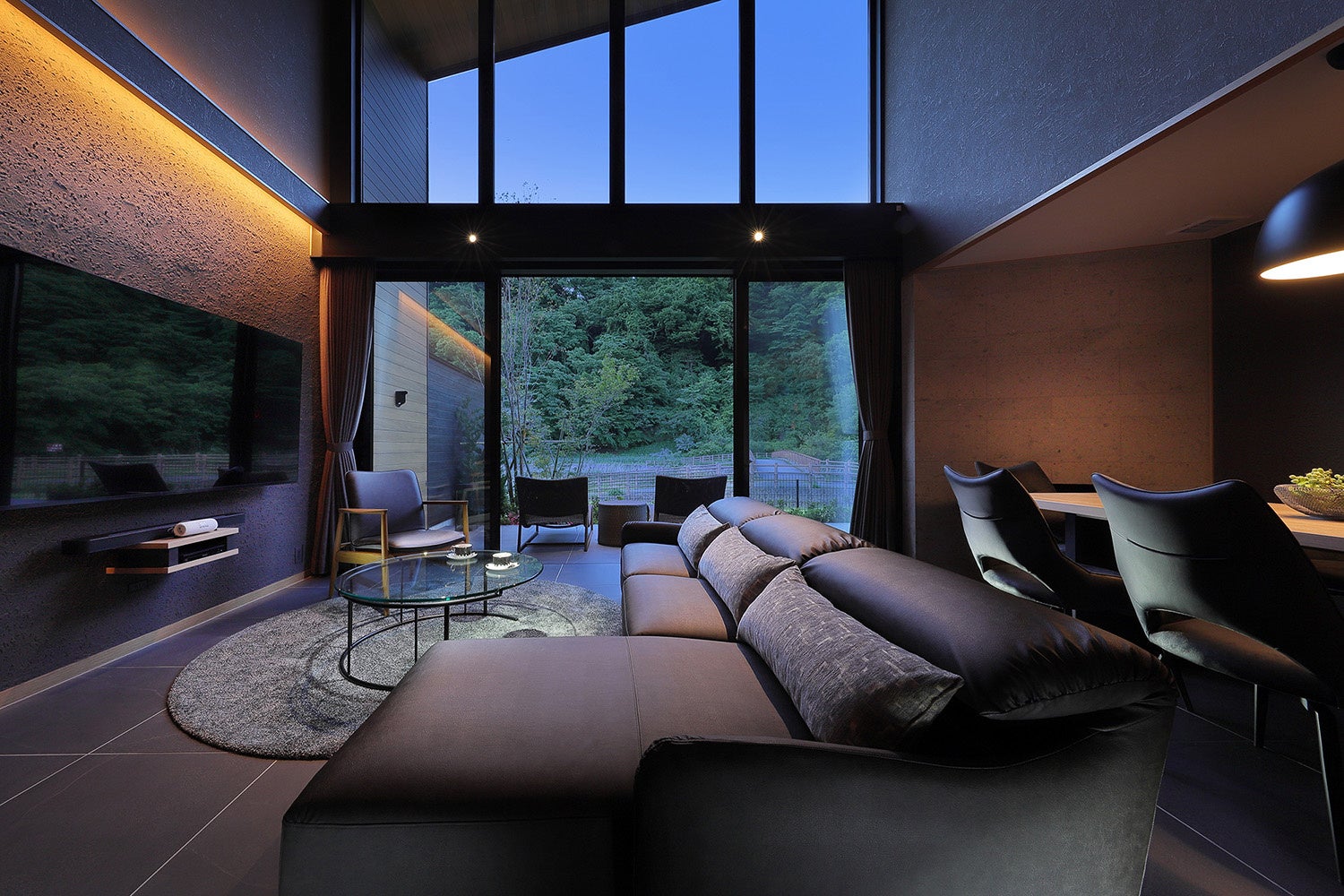 完全独⽴型のヴィラはメゾネットタイプで、200㎡の広さを誇る贅沢な間取り。落ち着いたカラーリングで統⼀されたリビングは吹き抜けで、2階まで届く⼤きな窓の向こうには箒川のせせらぎと上塩原の四季の景⾊が広がり、お部屋に居ながら屋外で寛ぐような解放感です。フロア奥の和室からはガラス越しにガレージに停めた愛⾞がショールームのようにご覧いただけます。