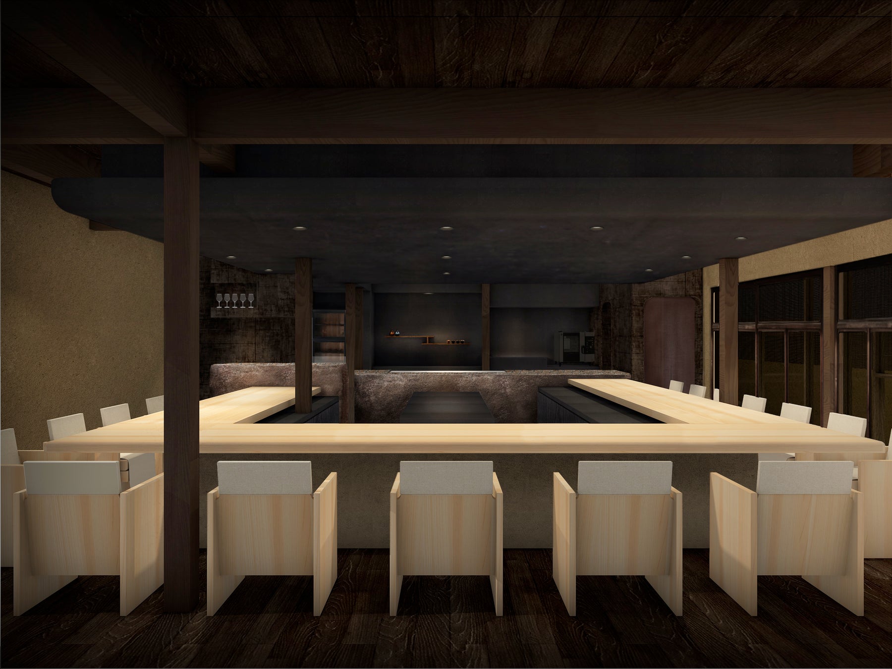 レストランは計16席がコの字型に並び、提供される食事が調理され盛り付けられる姿を目の前で眺めるライブ感のある空間となります。海と山に囲まれた倉敷の立地を活かし、地元で採れた山海の幸を和の技法で調理し、滋味を最大限に引き出します。