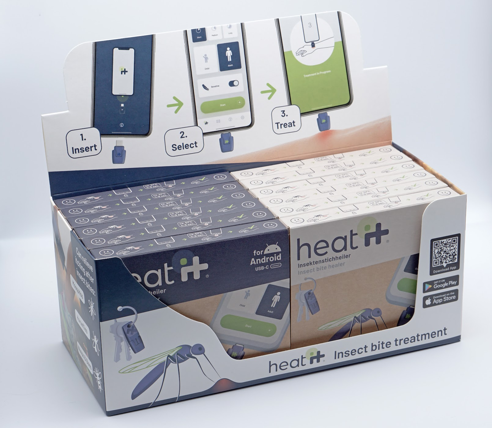 「heat it®」は、スマートフォンの充電ポートに接続し、患部に短時間あてるだけでかゆみを軽減する虫刺され対策機器です。ドイツで医療機器として認定されており、3歳からの利用が可能です。操作は専用アプリを通じて行い、12の異なるヒートモードが設定でき、4秒から10秒で処理が完了します。また、化学物質を使用せず、スマートフォンの充電だけで使用できるため、エコフレンドリーな製品です。