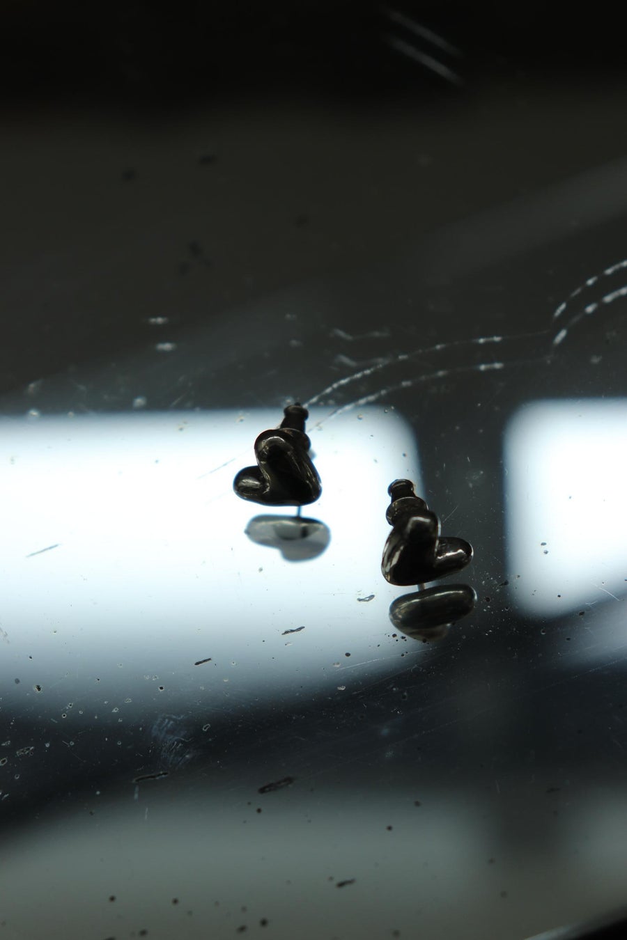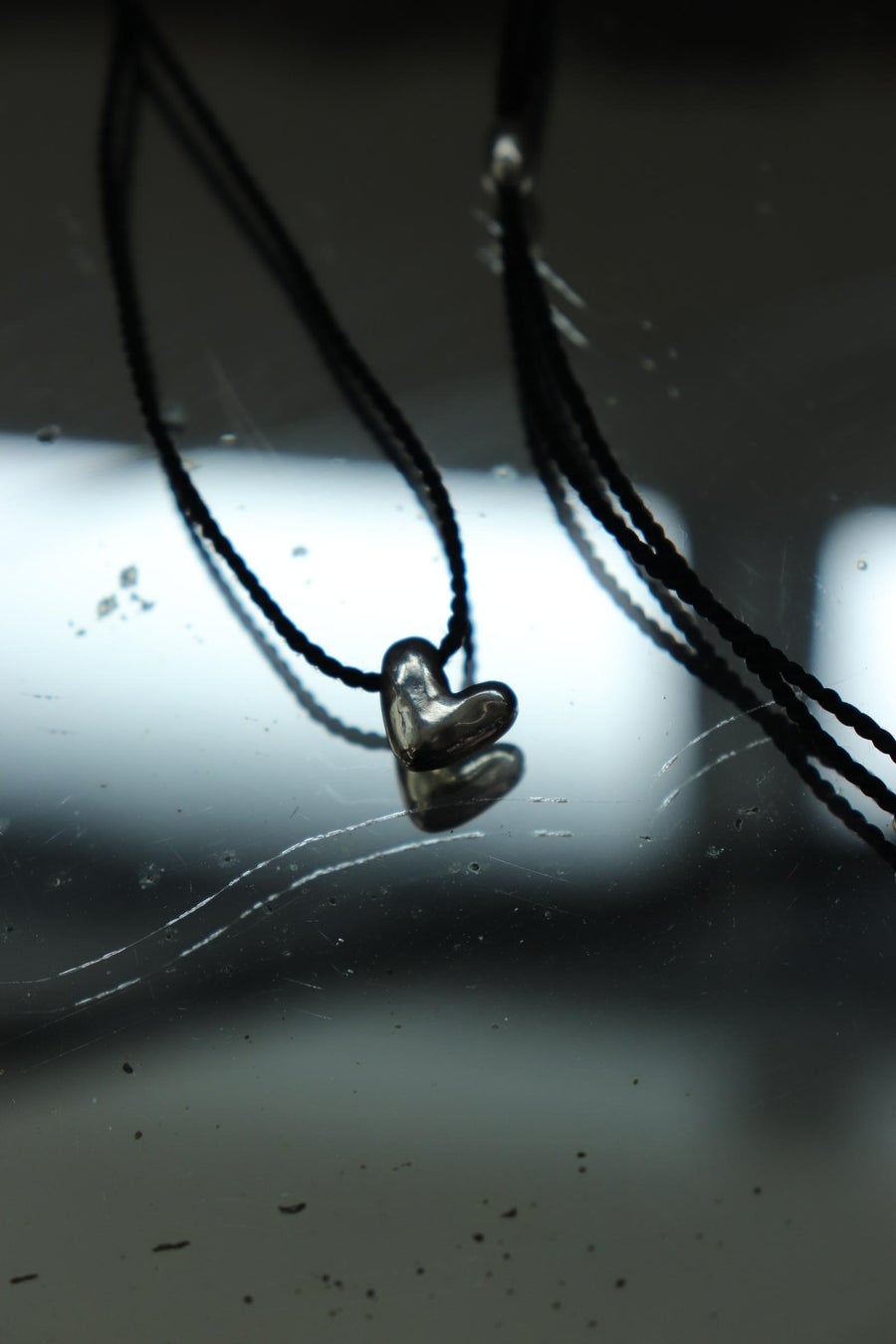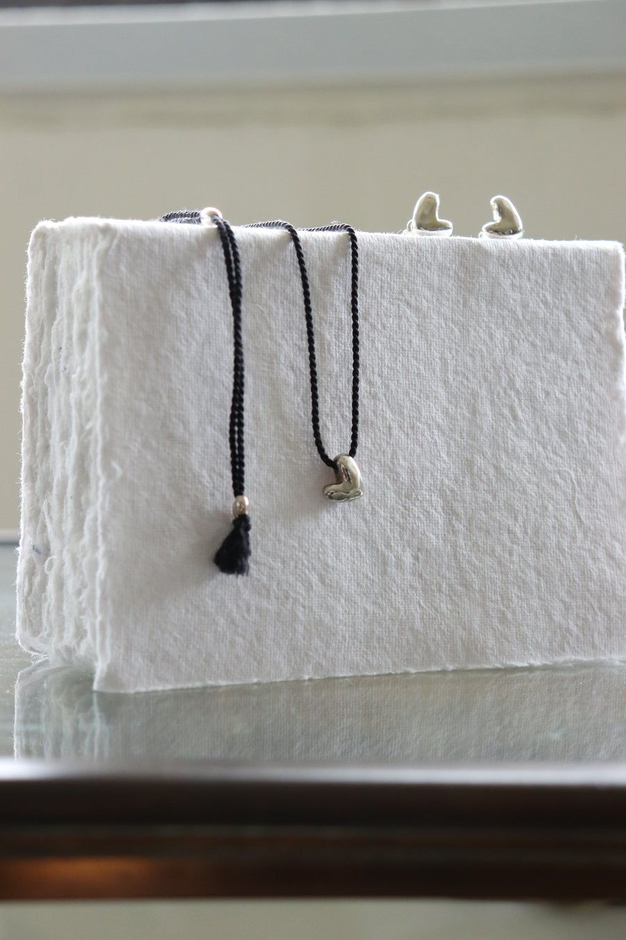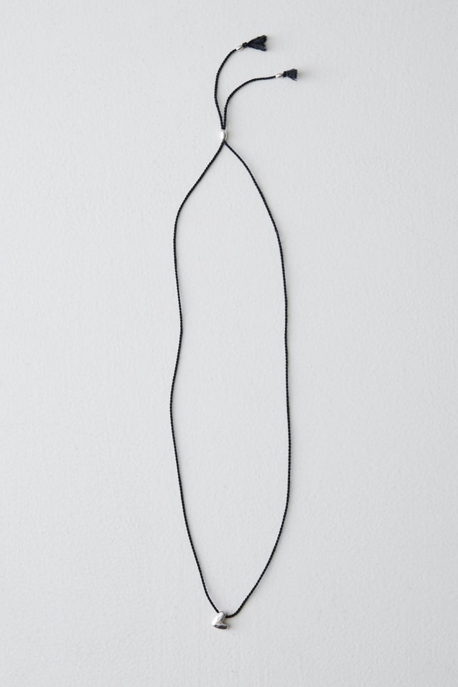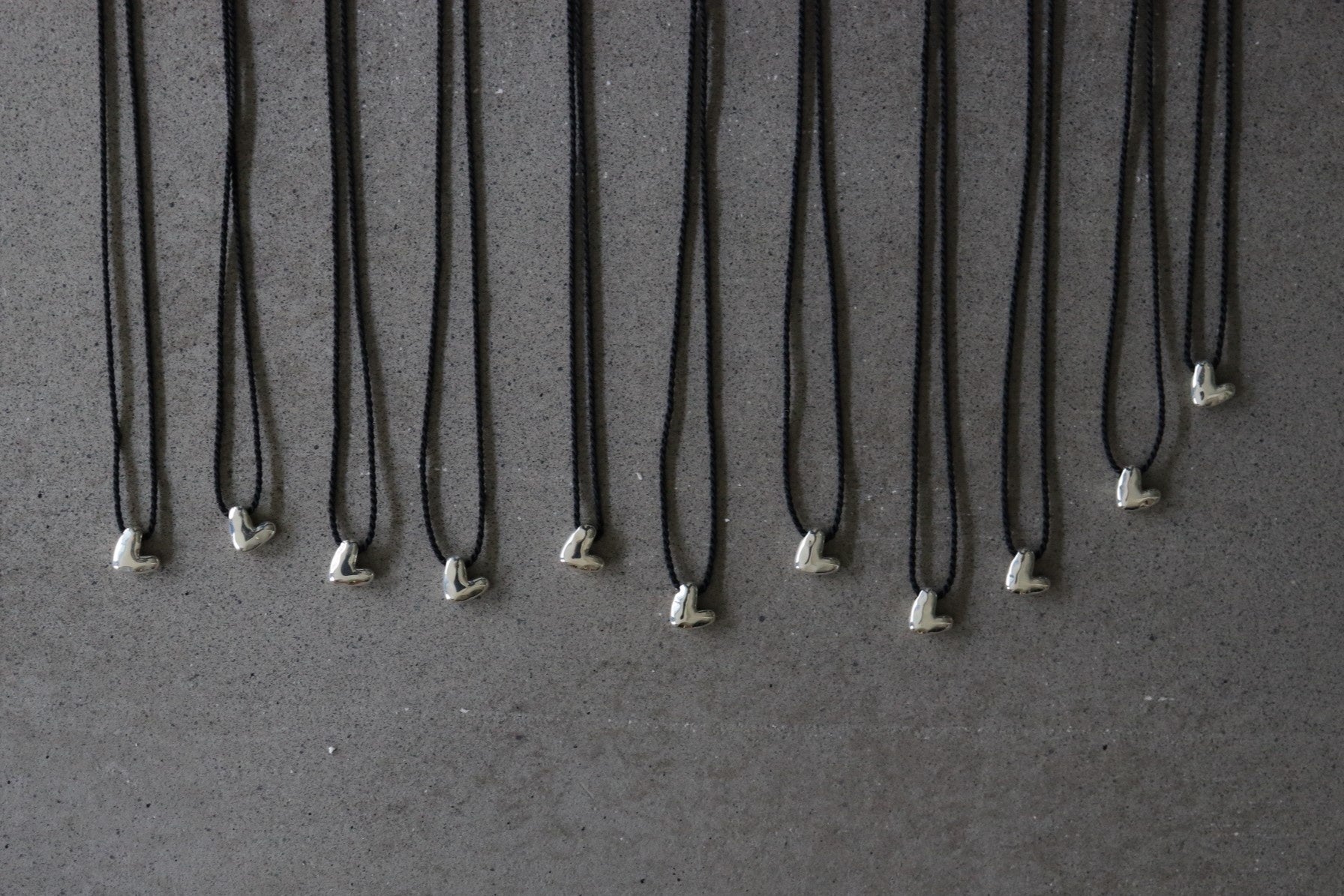 Uneven Heart Necklaceは黒いシルクのコードがよりシャープさを引き立てています。チェーンは使っていないので金属アレルギーのある方も安心してお使いいただけます。