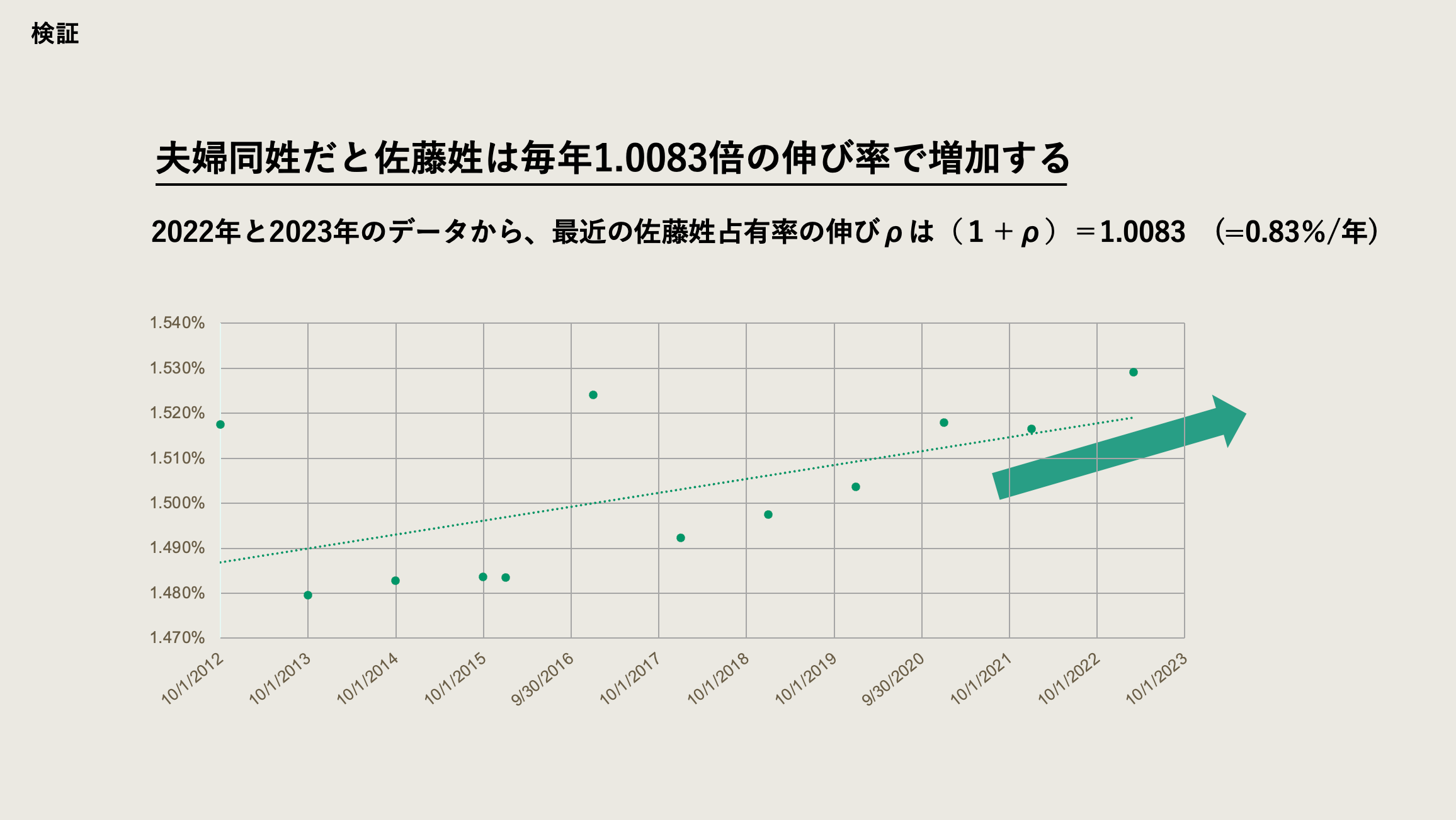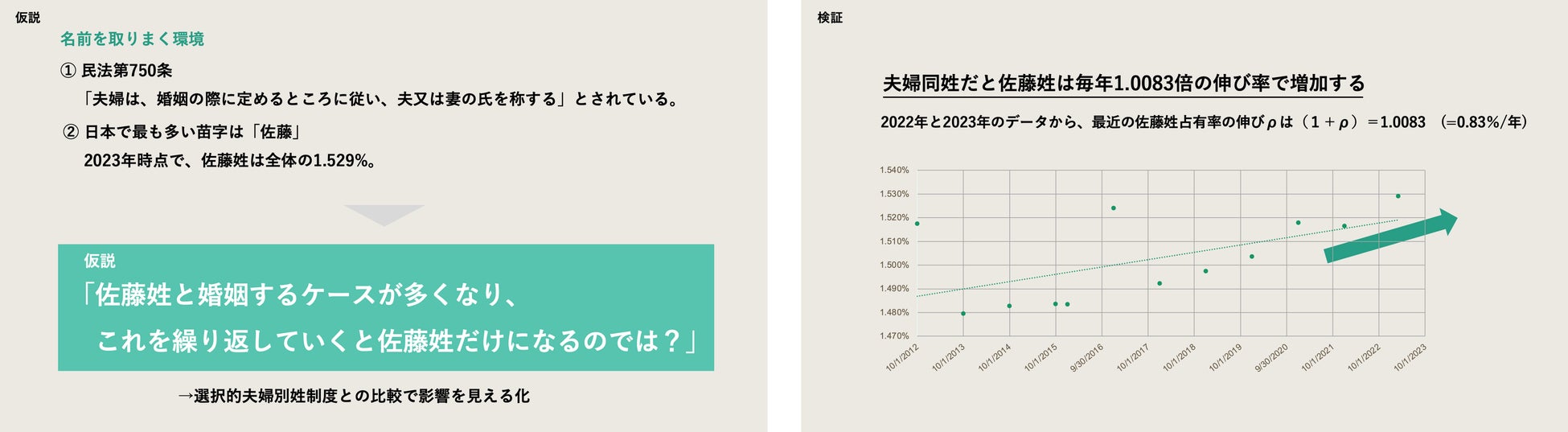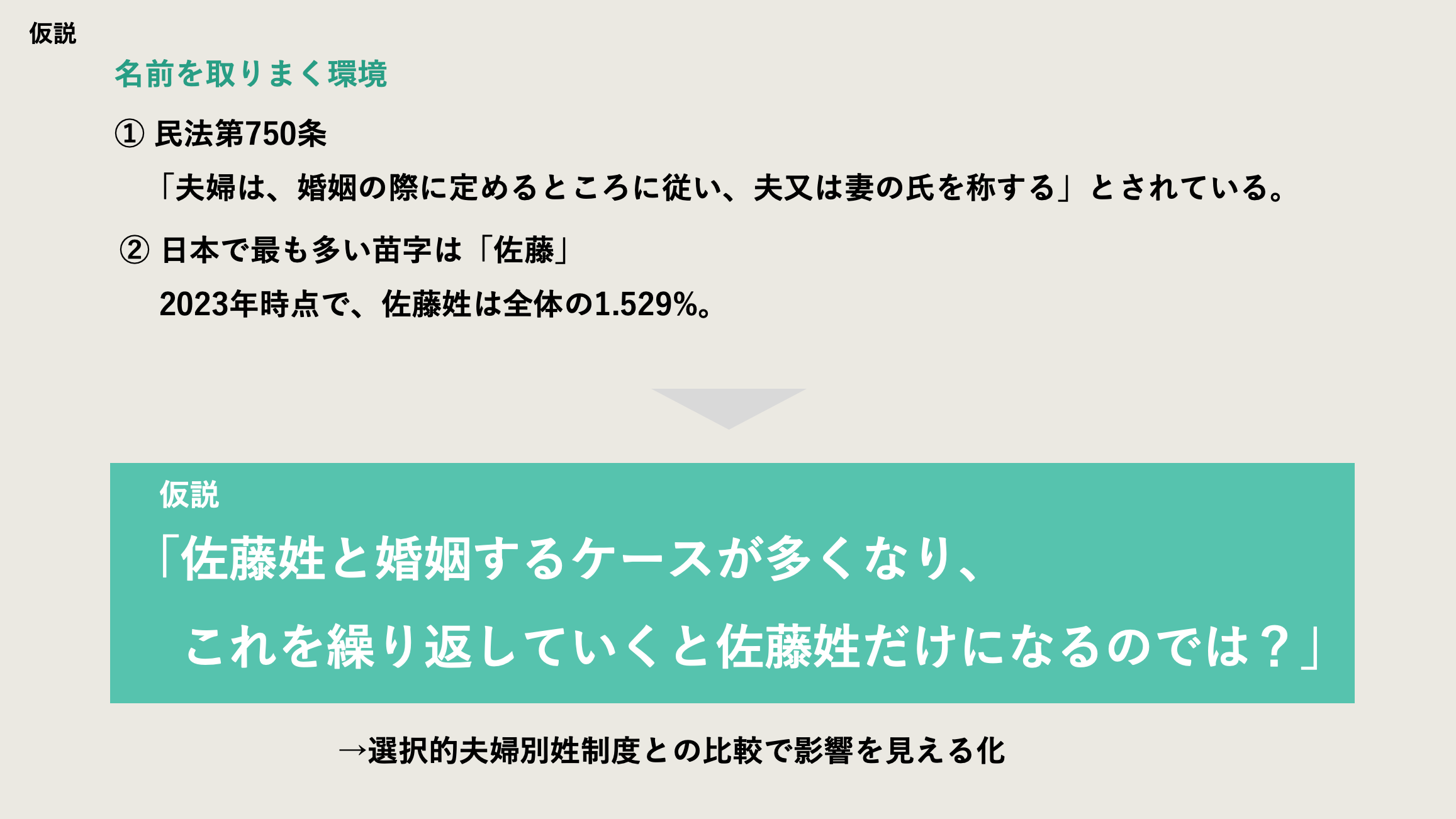 日本は世界で唯一、夫婦が同じ名字にしなくてはいけません。毎年50万組が結婚し、夫婦同姓により毎年50万の名字がなくなっています。13万種類あった苗字の種類も、現在の仕組みが続いた場合、“徐々に名字の種類が減少し、やがて1つの名字になってしまうのではないか”という仮説が生まれました。日本で最も多い名字は「佐藤」であり、2023年時点で、佐藤姓は国民全体の1.529%といわれています。