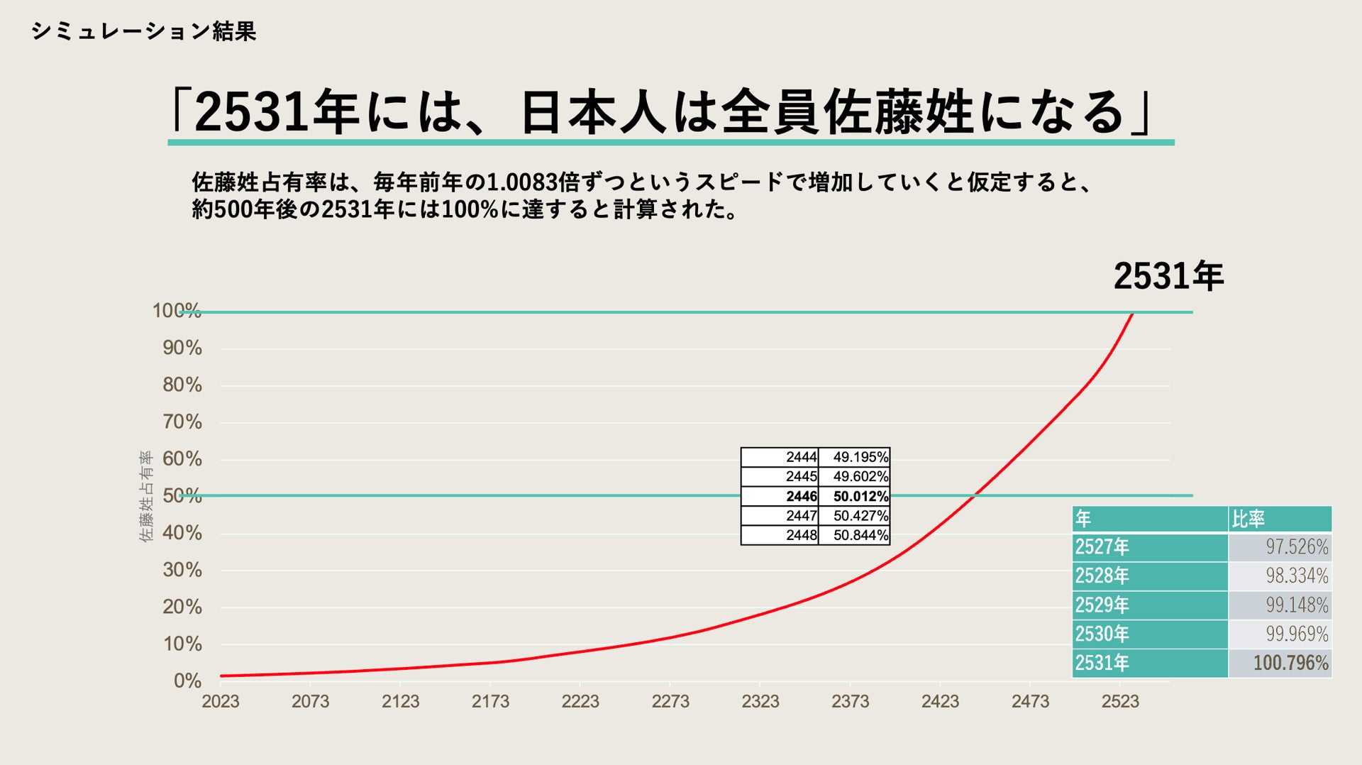 そこで「Think Name Project」の一環として、東北大学経済学研究科/高齢経済社会研究センター 吉田浩教授にあすにはが独自調査を依頼し、佐藤姓の増加率および人口動態から分析を行いました。その結果、選択的夫婦別姓が導入されず夫婦同姓のままの場合「約500年後の2531年には、佐藤姓が100%に達する。」というシミュレーションが導き出されました。