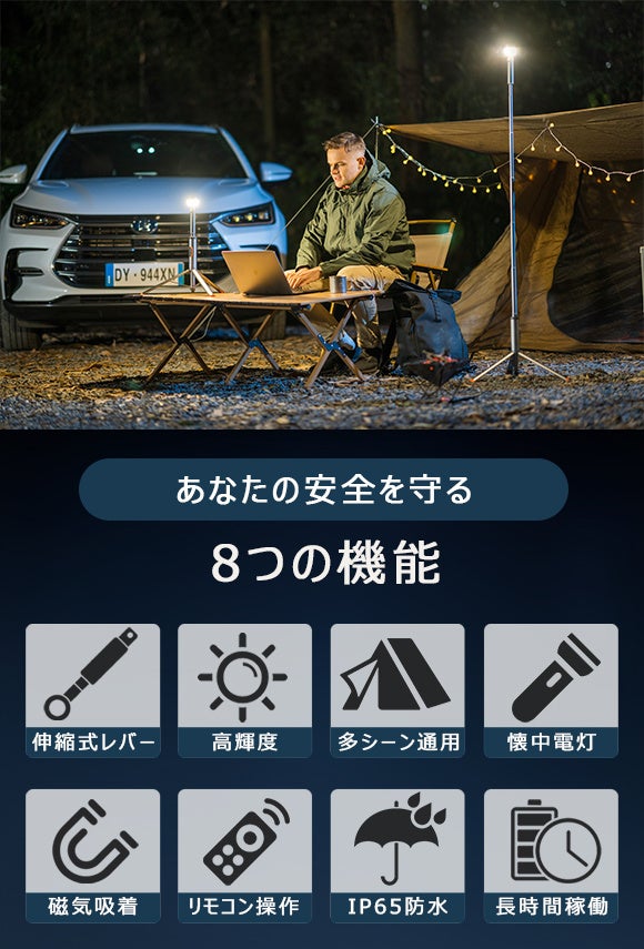 三脚スタンド設計で、テーブルの上にスタンドランプとして使うことができます。屋外で仕事をするときでも、バーベキューを楽しむときでも役に立ちます。