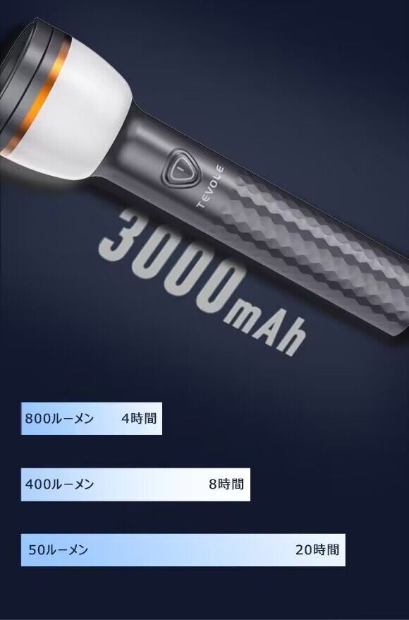 「TEVOLE」は3000mAhのバッテリーが内蔵されており、最大約20時間(50ルーメン低輝度の場合)ご利用いただけます。その長い耐久性は、夜間の照明ニーズをすべて満たしてくれます。