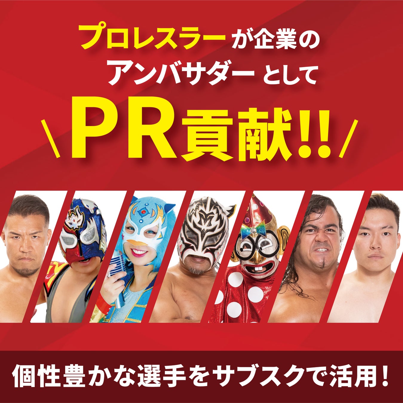 本サービスは、個性豊かな登録プロレスラーがアンバサダーとして企業や店舗のPRをお手伝いさせていただき、他社には無いプロレスに特化した『力強さ』『印象強さ』などを実現いたします。