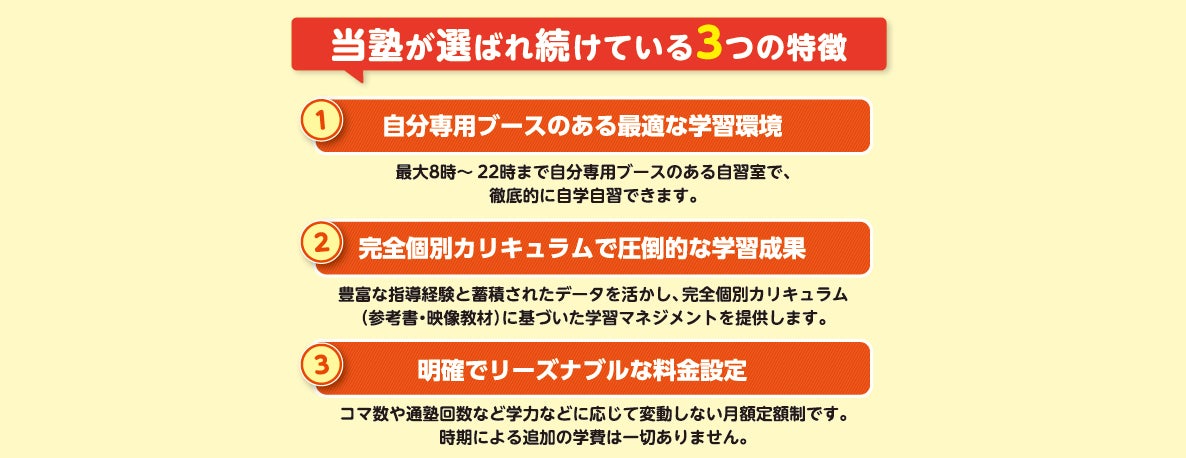 大学受験のプロが専任する大学受験専門塾。対象は中学生・高校生・高卒生。当塾は少人数・定員制で、自学自習(個別指導)スタイルを採用。最大8時〜22時まで勉強できる自分専用席の自習室を完備。長年にわたる指導実績とデータを活かし、完全個別カリキュラム(参考書・映像教材を活用)に基づいた学習マネジメントを行い、「合格に繋がる高い学習成果」と評判。画一的な指導ではなく、生徒に寄り添いながら一人ひとりの能力を最大限に高め、志望校合格の先までナビゲートします。