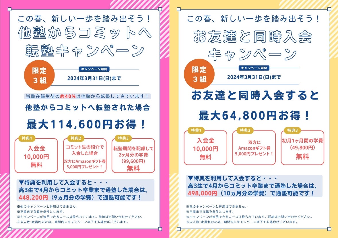 【大学受験専門塾コミット希望ヶ丘校】この春新しい一歩を踏み出すWキャンペーン『転塾キャンペーン』&『同時入会キャンペーン』実施!!【2024年3月31日まで】