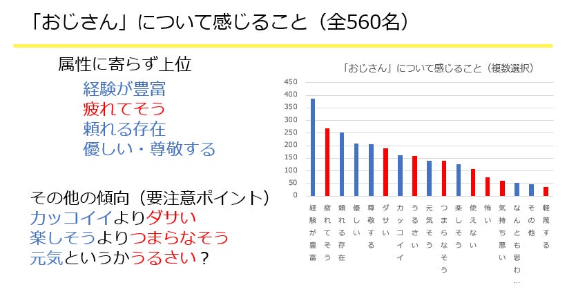 回答者がおじさんについて感じることは、年代に寄らず、傾向はほぼ同じでした。上位はポジティブ(青字)な印象が多い一方で、中位以下にはネガティブ(赤字)なものも多く、改善していくポイントが見て取れます。