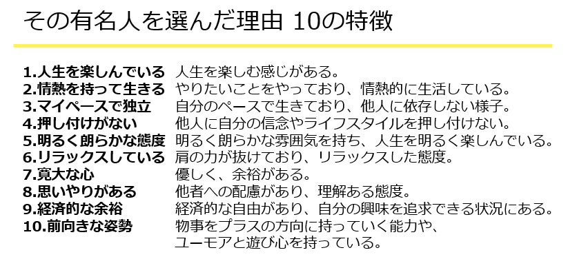 また回答者に聞いた「なぜその有名人を選んだのか」の理由を10の特徴にまとめました。