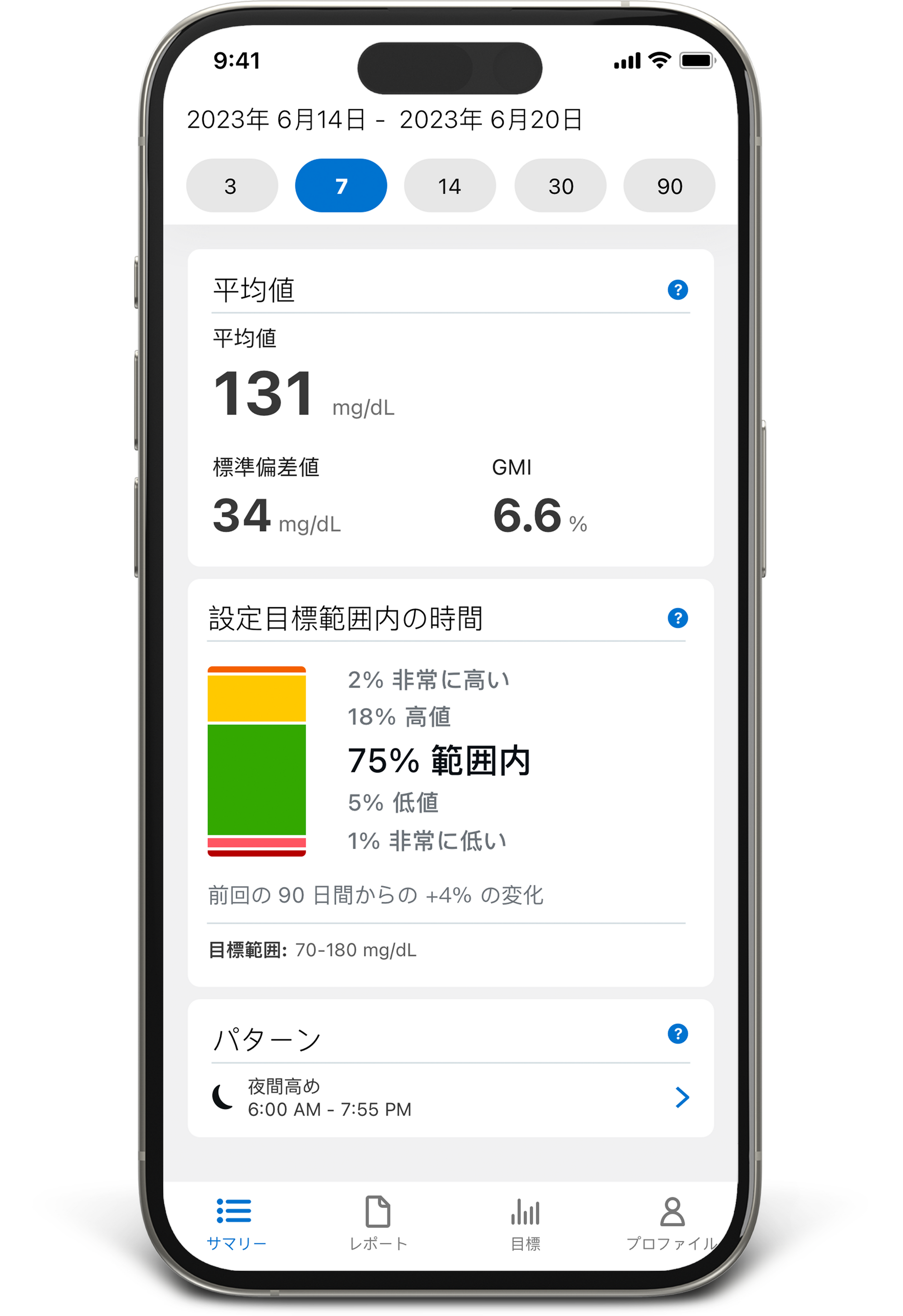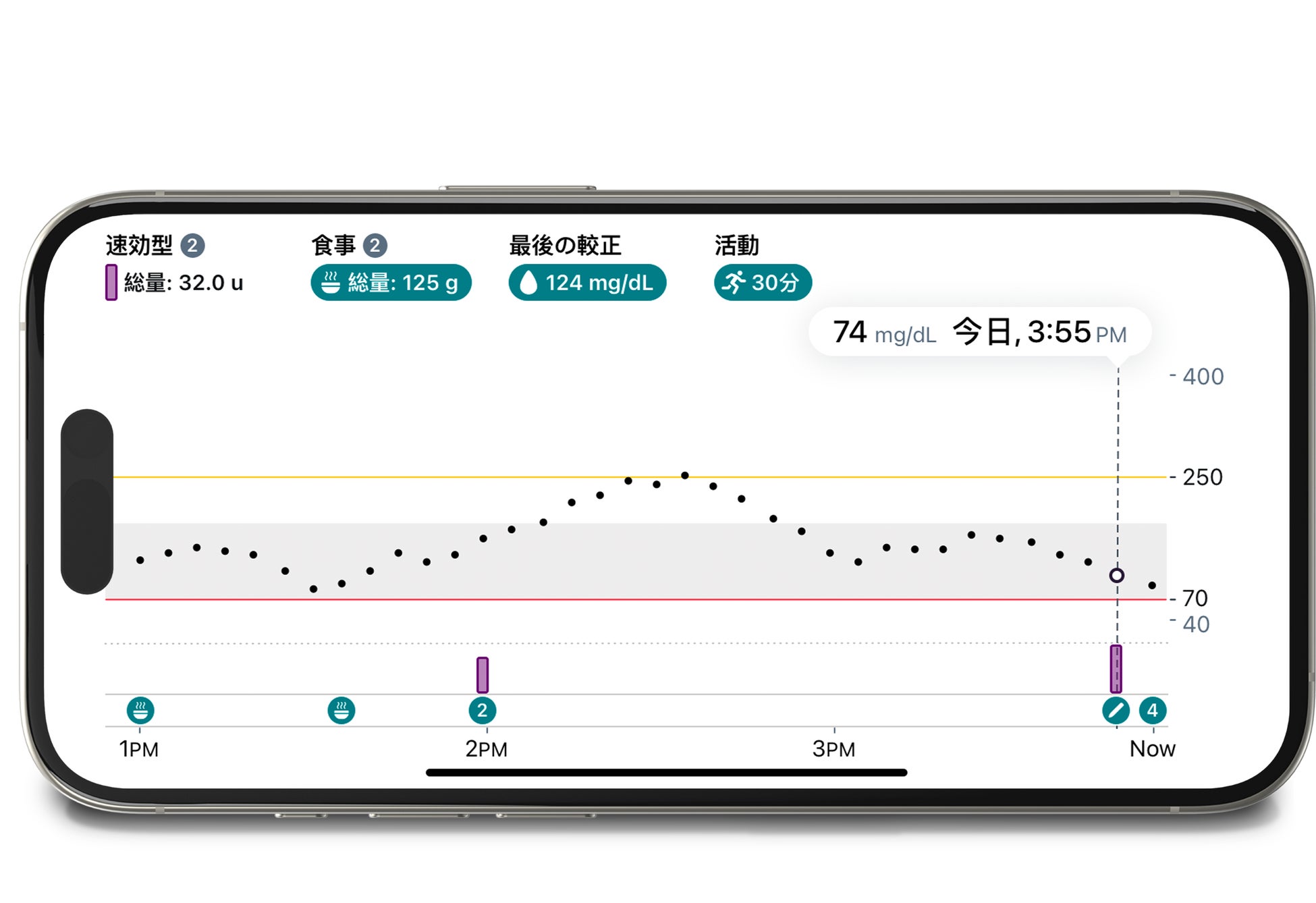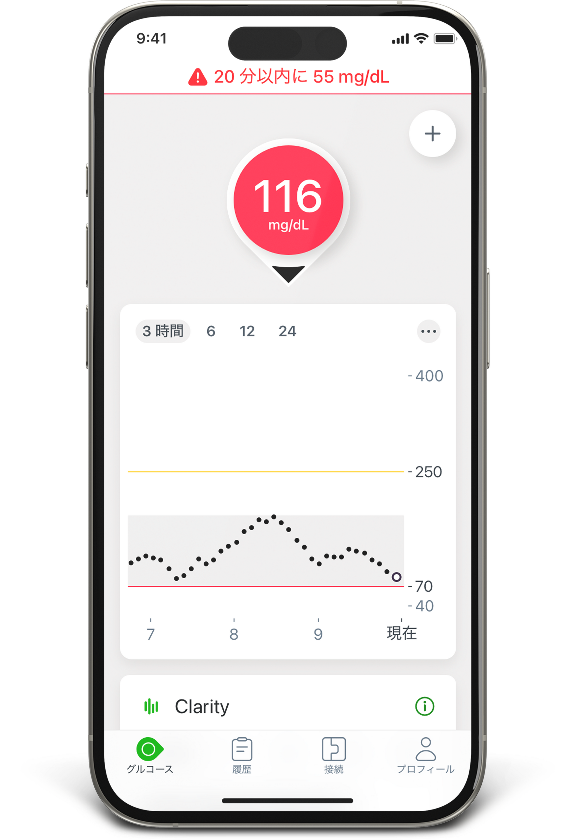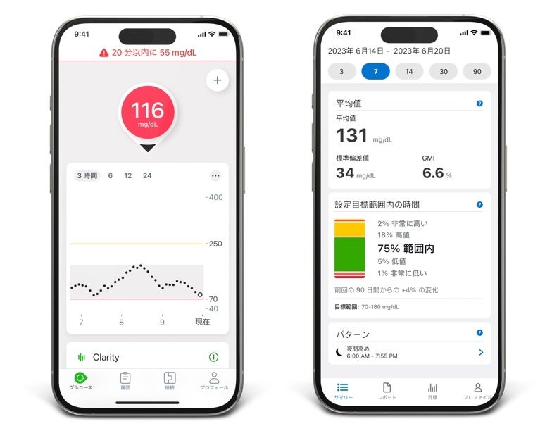 医療従事者による患者の糖尿病のマネジメントを効果的に支援するソフトウェアDexcom Clarity(9)(10)と統合した簡便なモバイルアプリで、リアルタイム並びに過去のグルコース測定値の確認が可能