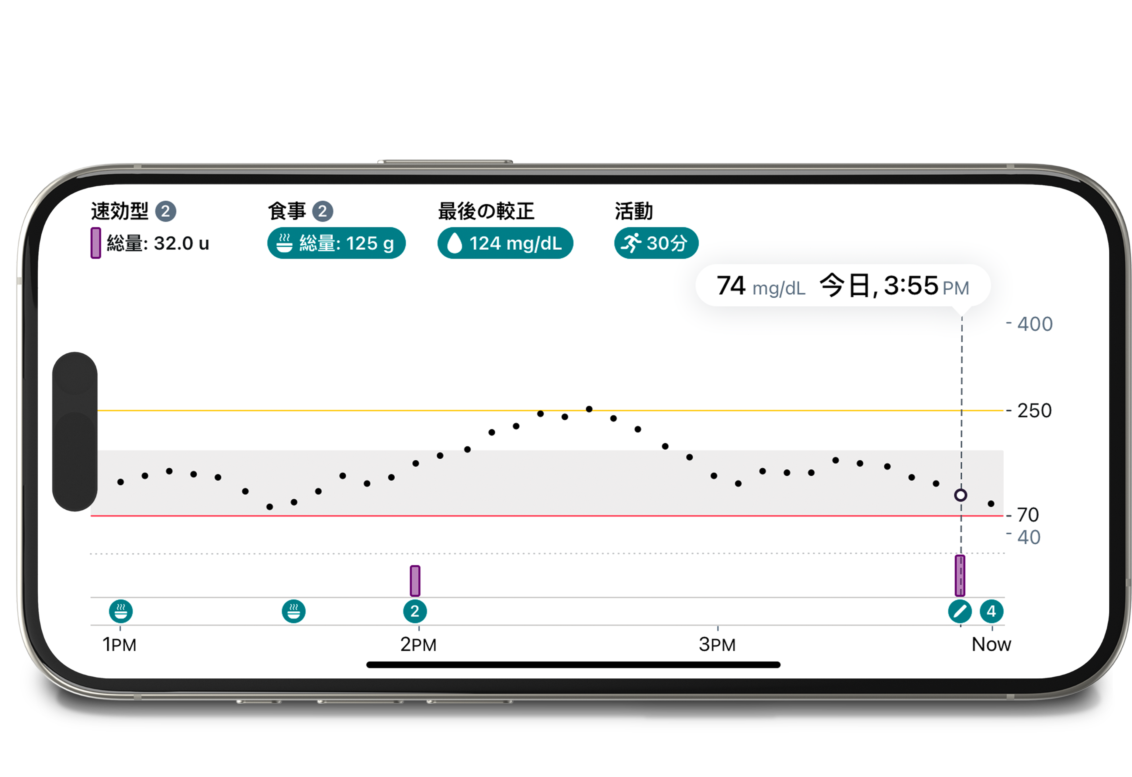 緊急低値リスクアラート:グルコース濃度の測定値が急下降し、20分以内に55mg/dL以下になる可能性があることを予測して知らせる機能