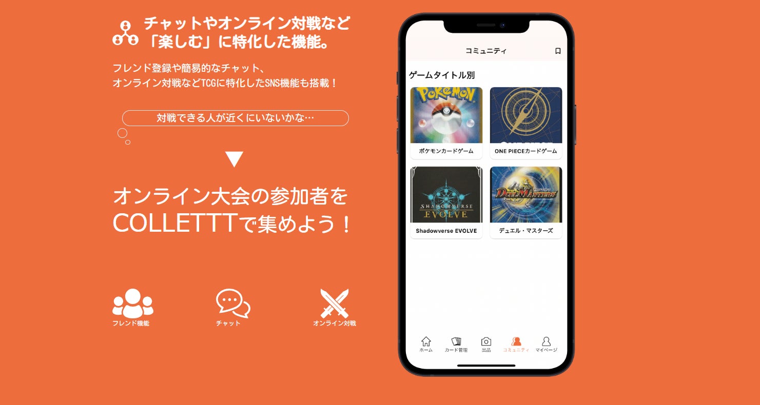 チャット、オンライン対戦の呼びかけや、フレンド機能など、ユーザーが繋がるための多彩な機能を提供。同じカードゲームを楽しんでいるユーザーと情報交換をしたり、オンライン対戦の呼びかけや大会の告知などを自由にすることができます。