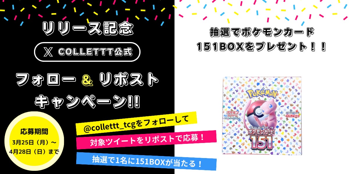『COLLETTT』のXアカウント(@collettt_tcg)をフォローし、投稿をリポストするだけで、抽選でポケモンカード151のボックスをプレゼントします。この特別な機会をお見逃しなく!