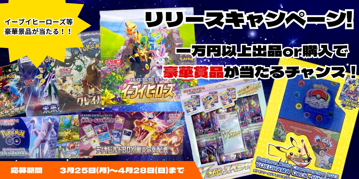 3/25(月)キャンペーン開始!Twitterフォロー&リポストでポケモンカード景品を手に入れよう!さらに、1万円以上の取引でイーブイヒーローズなどの豪華景品が当たるチャンス!