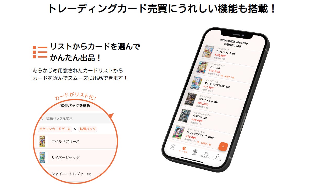 用意されたリストからカードを選択し、簡単に出品可能。直感的な操作で、写真のアップロードや説明の入力を行え、手間をかけずに取引を開始できます。