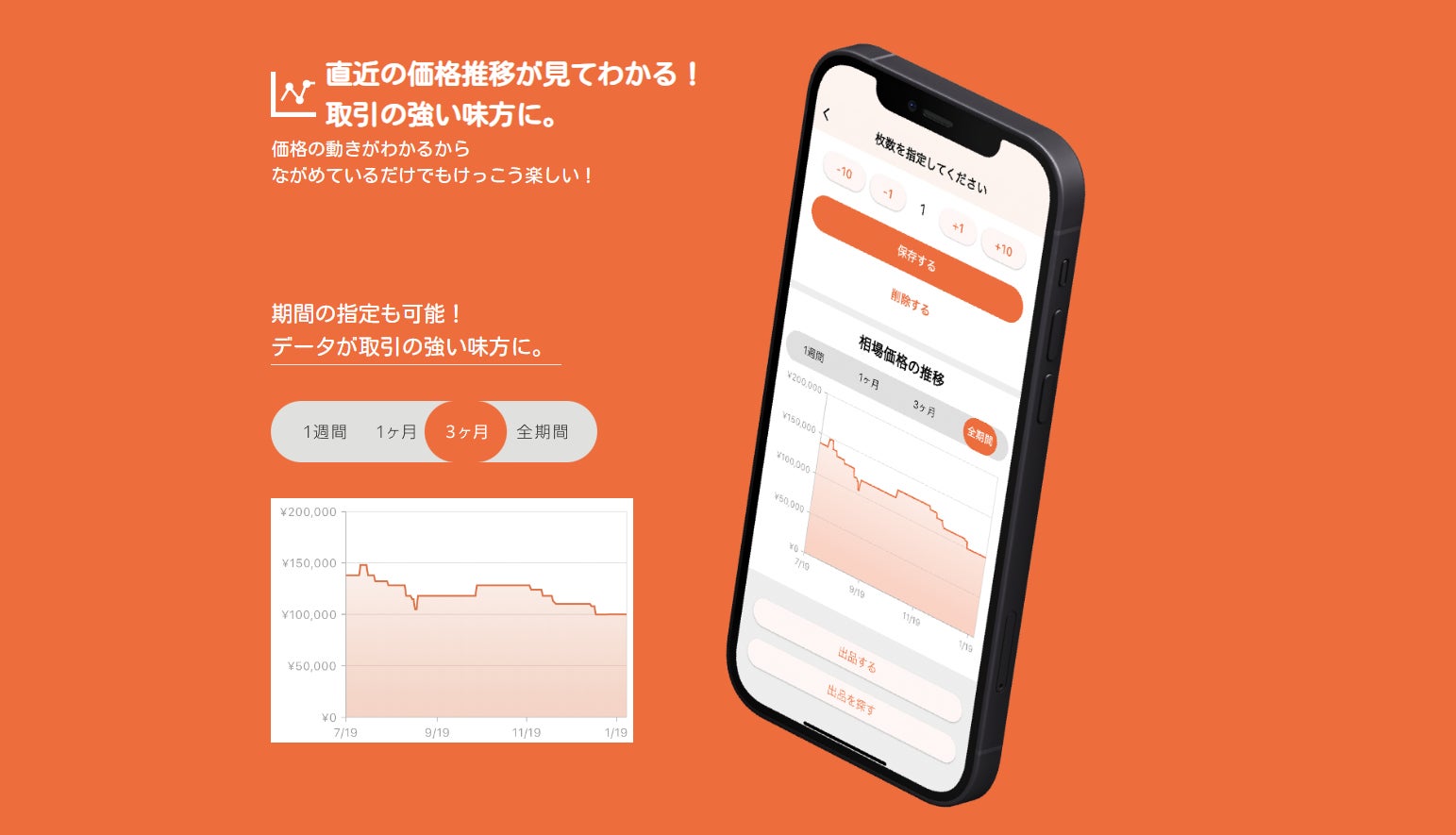 各トレカの価格推移をグラフで表示。市場の動向を視覚的に追跡し、カードの価値が上昇傾向にあるか、または下降しているかを判断するのに役立ちます。