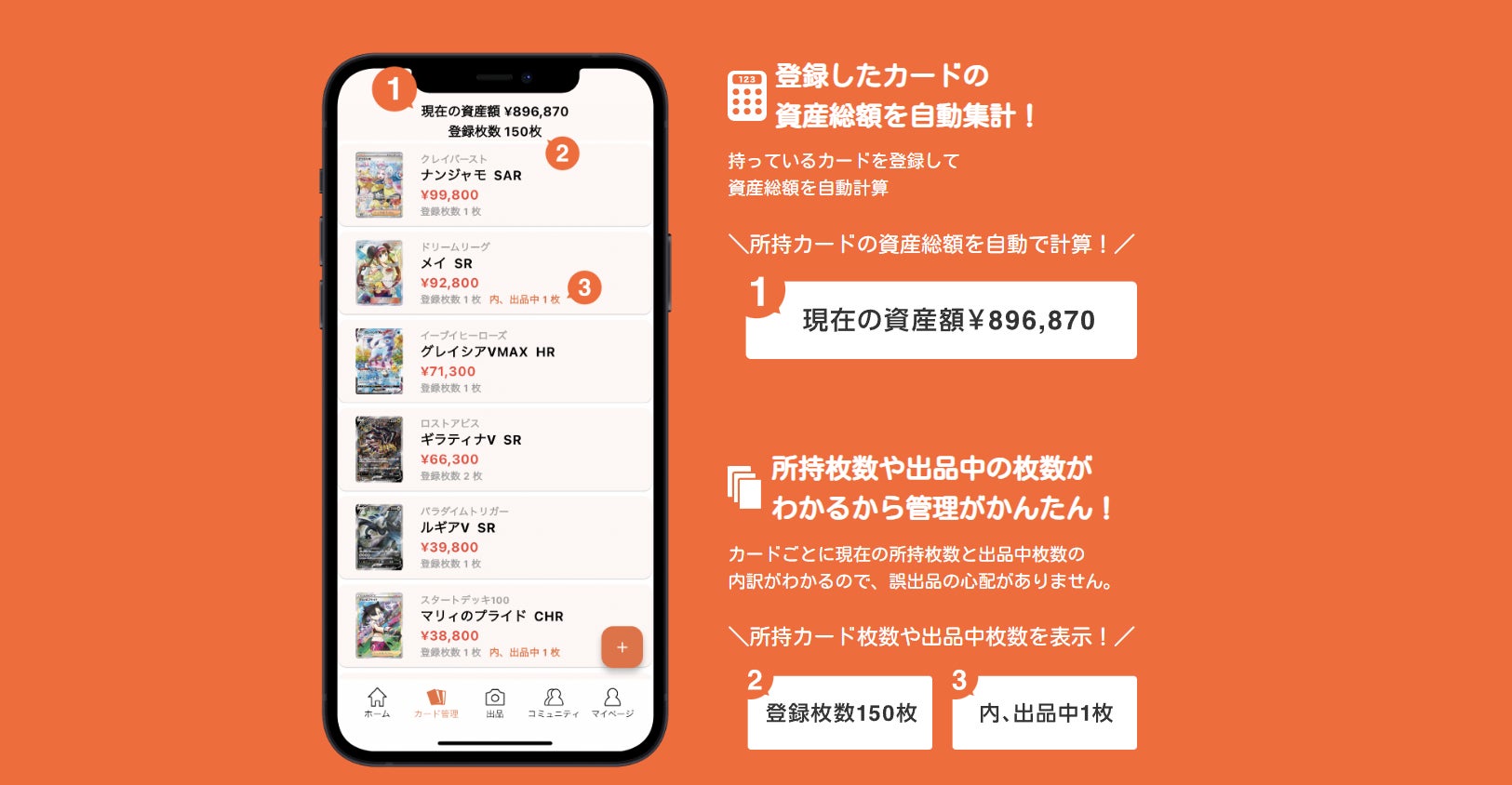 アプリに自身の保有カードを登録するだけで、各カードの市場価格に基づいた資産総額を自動で算出します。これにより、いつでもコレクションの現在価値を把握することが可能になります。