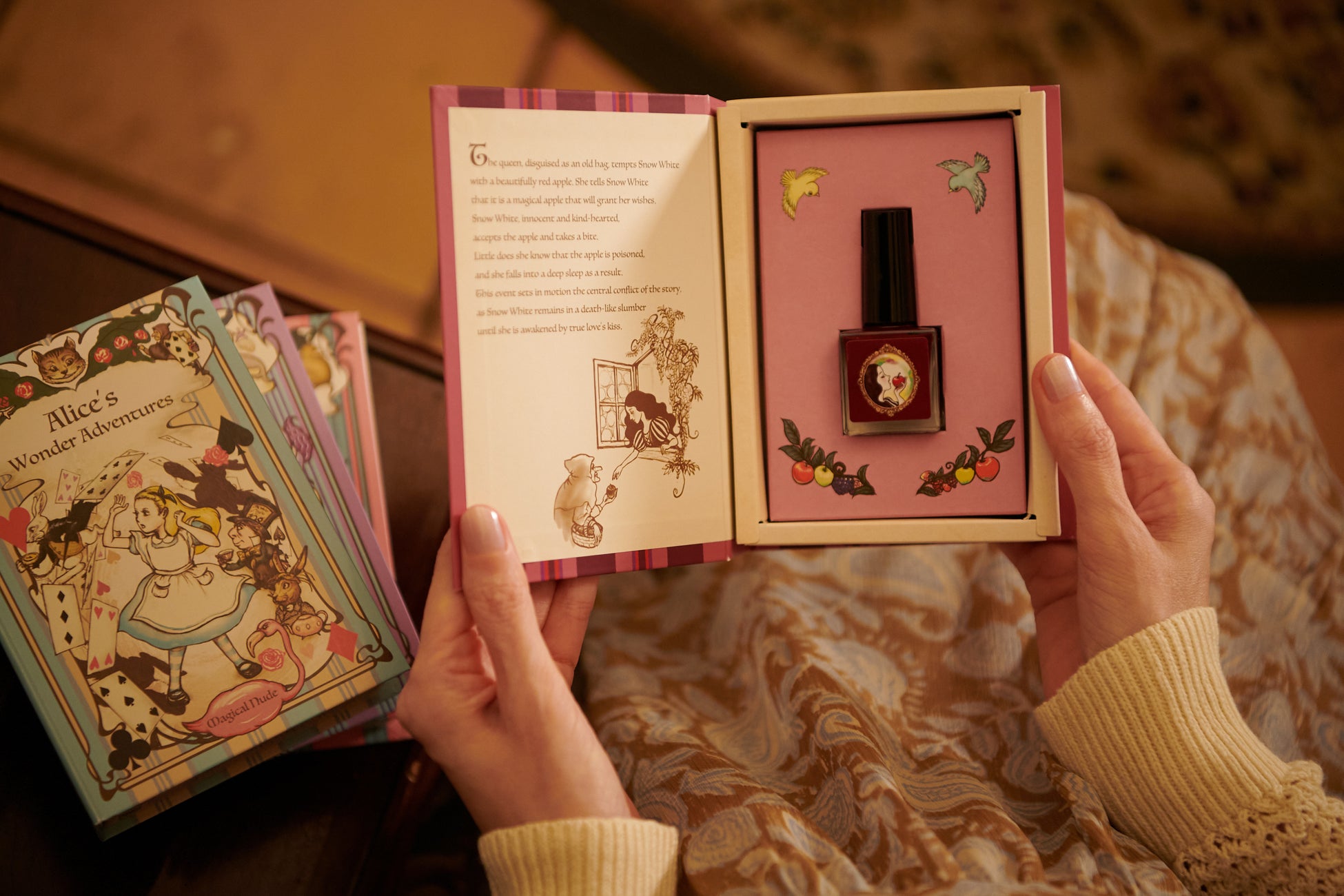 「ストーリー・イン・カラー」は、ニュージーランド在住の絵本作家・イラストレーターとして様々な広告にイラスト提供のほか、絵本『赤はなのトナカイ ルドルフ』『サンタがまちにやってくる』の作画などを手がけるkyonさんと、ネイルサロンが共同で手掛けた特別な商品です。各ネイルカラーは、まるで絵本のような美しいBOOK型スタイルのパッケージで、童話の物語からインスパイアされた独自の色彩と、ネイルケア成分を配合しており、見た目の美しさと機能性を兼ね備えています。