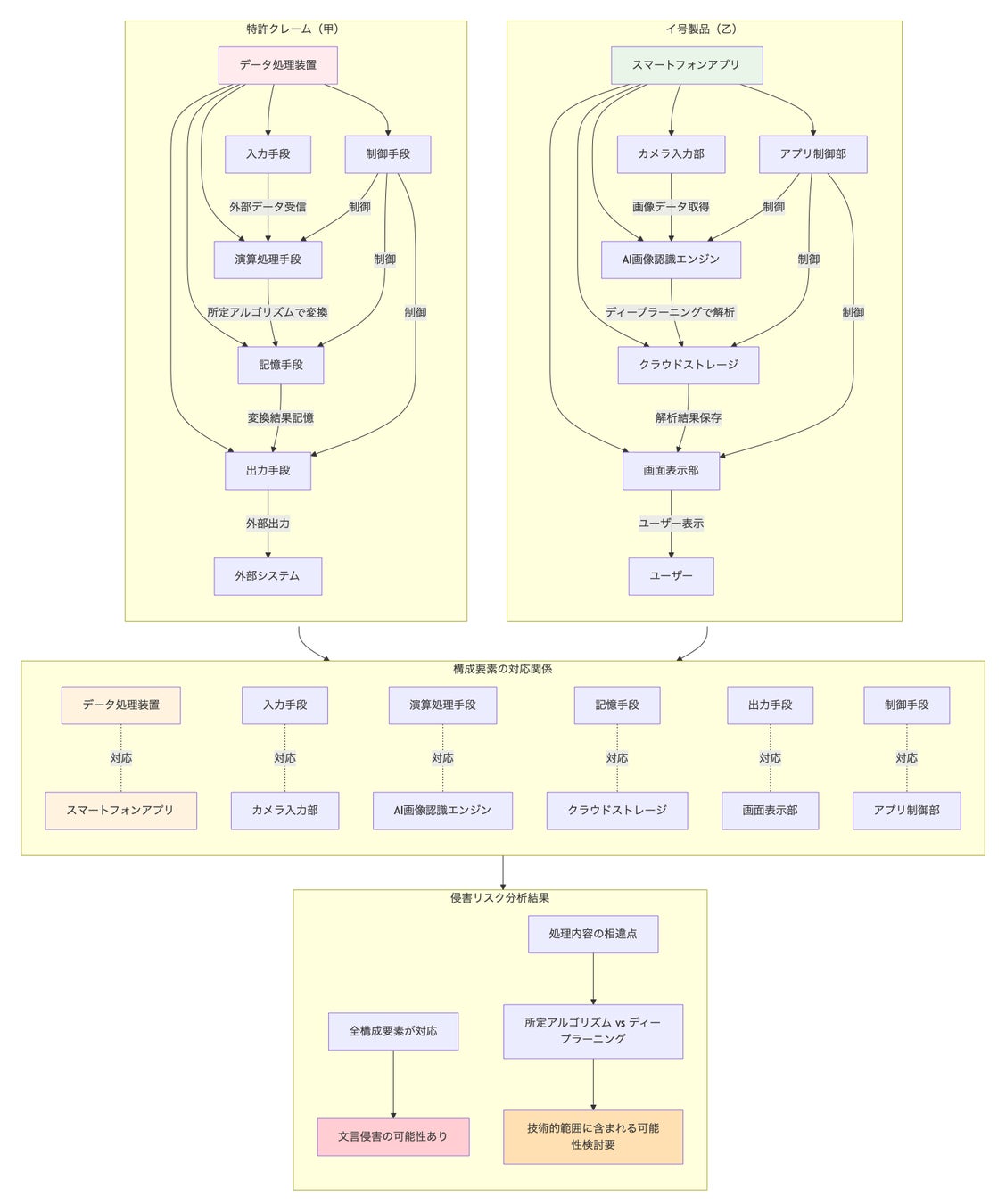 ② フローチャートに従った権利侵害リスク分析: 生成AIがMermaid記法でフローチャート化された判断プロセスに従って分析を行います。具体的には、「調査対象技術の整理→ 先行特許との一致点相違点の分析→ リスク評価」といった思考過程をフローチャートとして可視化し、AIが論理的なステップを踏んで権利侵害の可能性を評価します。