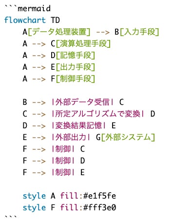 Mermaid記法とは、簡単なテキスト記述でフローチャート、組織図、ガントチャートなどのチャートを自動生成できる記法で、「flowchart TD; A[開始] --> B[処理] --> C[終了]」といった文字列を書くだけで矢印付きの図が完成します。エンジニアやプロジェクト管理の現場で広く使われており、GitHub等でも標準サポートされている業界標準の図表記述方式です。