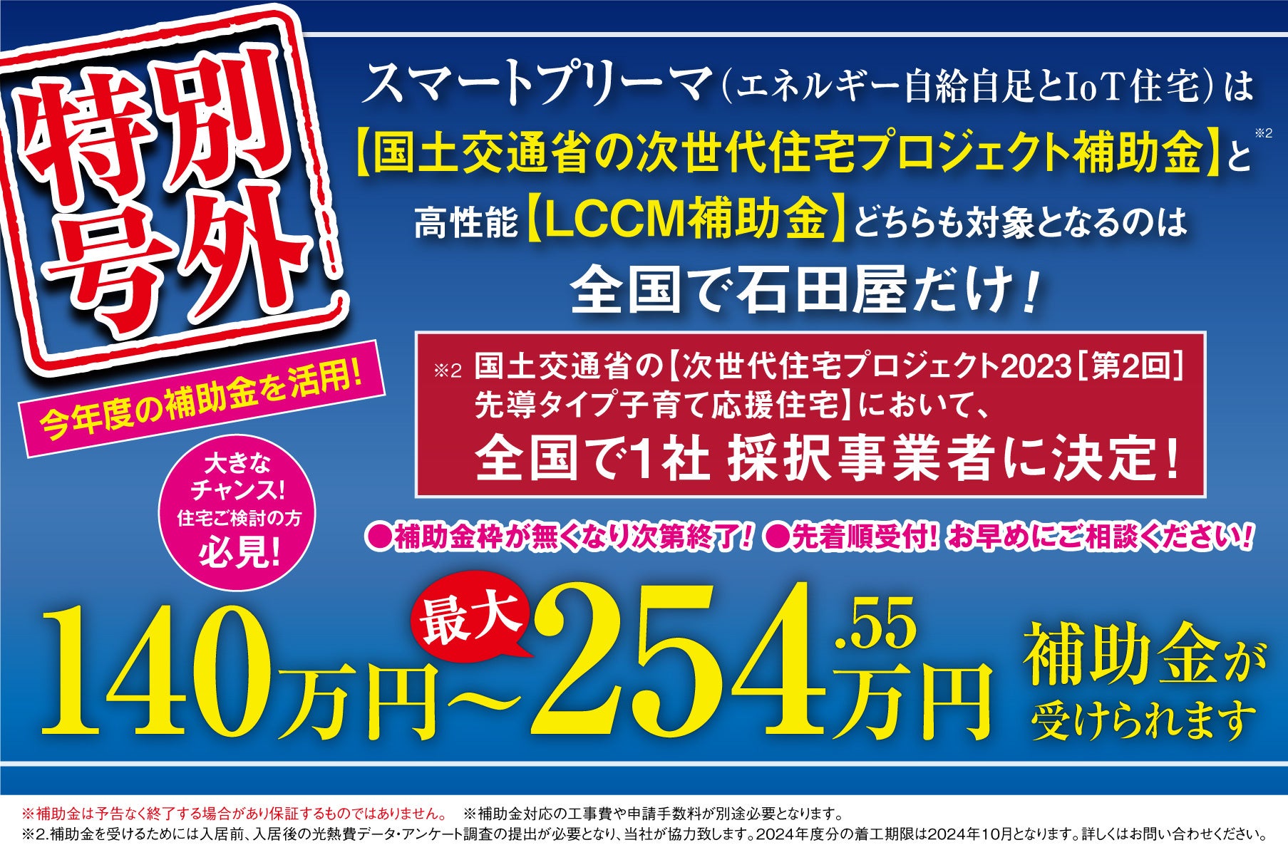 【補助金情報】全国で石田屋だけ!「国交省の次世代住宅プロジェクト」ほか最大254.55万円の補助金が受けられるチャンス