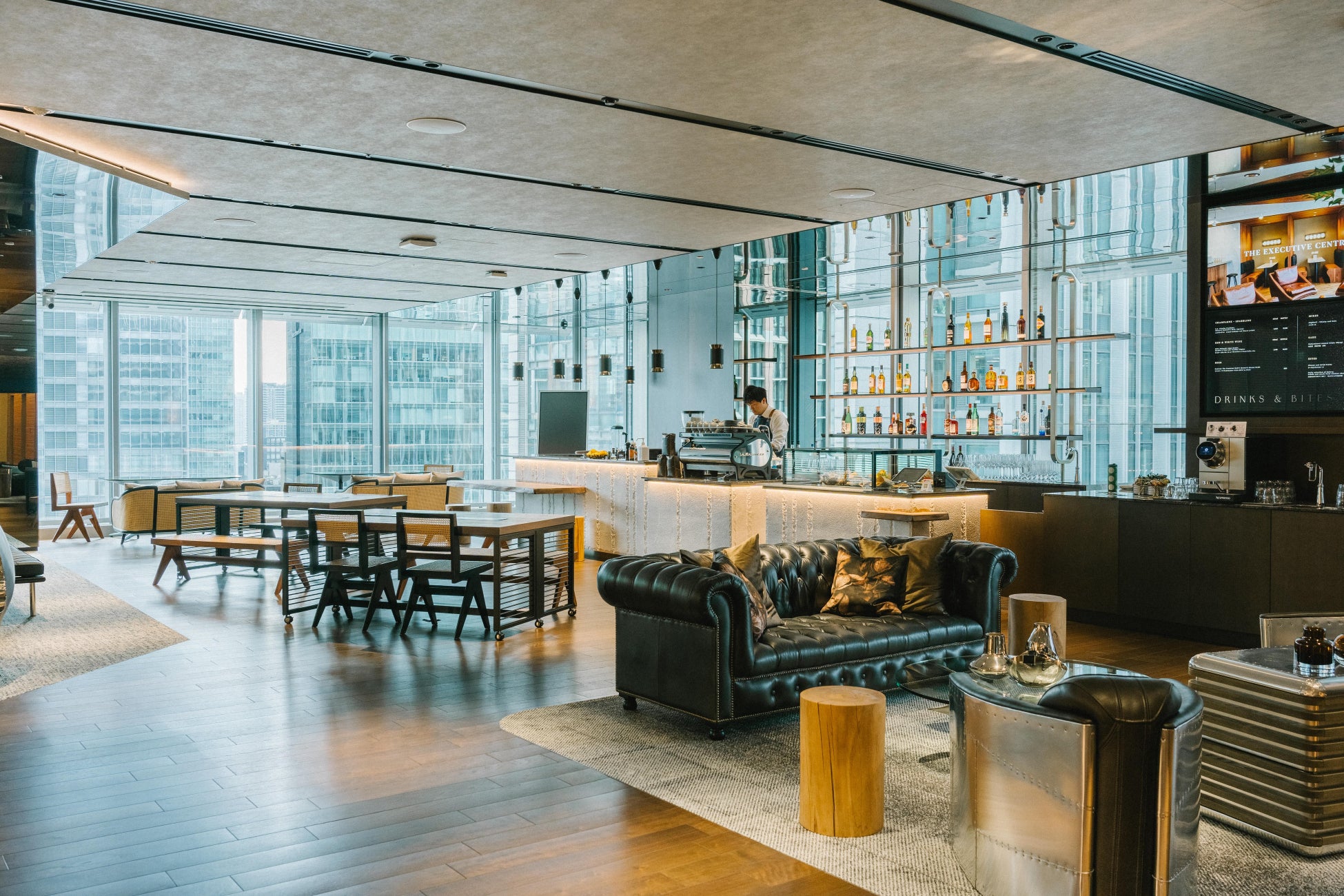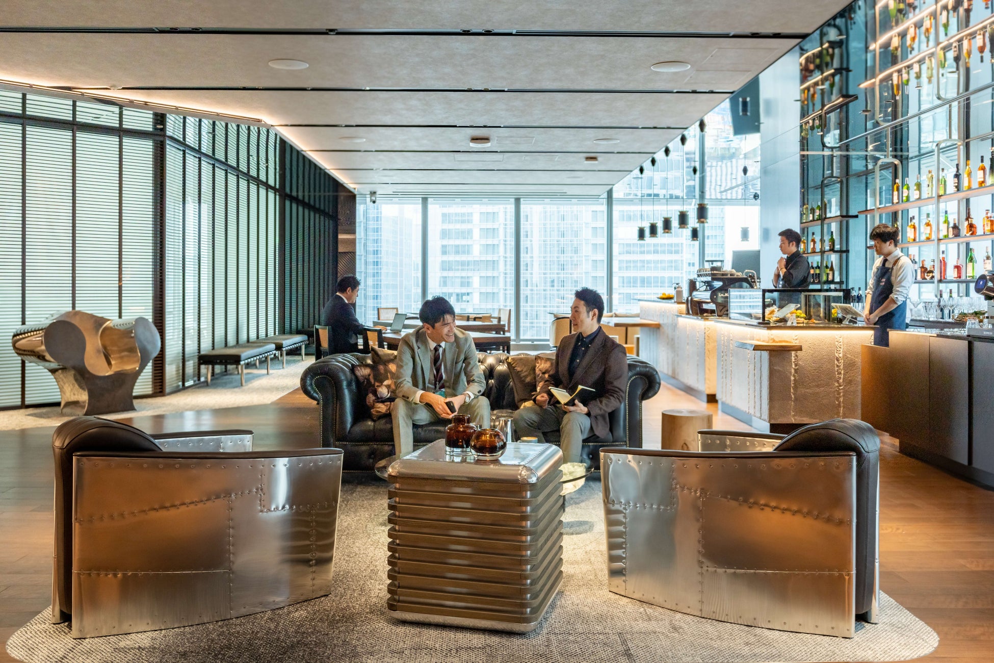 14階に位置する『JPタワー』センターの特徴は、大きな窓から東京駅や皇居を一望できるラウンジエリアです。ラウンジエリアは、洗練されたデザインが魅力で、高級感のあるインテリアを使用し、上質な空間を演出しています。中央部分には、品揃え豊富なバリスタバーがあり、厳選されたプレミアムコーヒー、アルコール飲料、フードメニューを楽しむことができます。ラウンジエリアには、ヴィンテージデザインで有名なティモシー・オルトンの家具が配され、快適さと落ち着いた雰囲気を醸し出し、メンバー同士の交流を促進します。