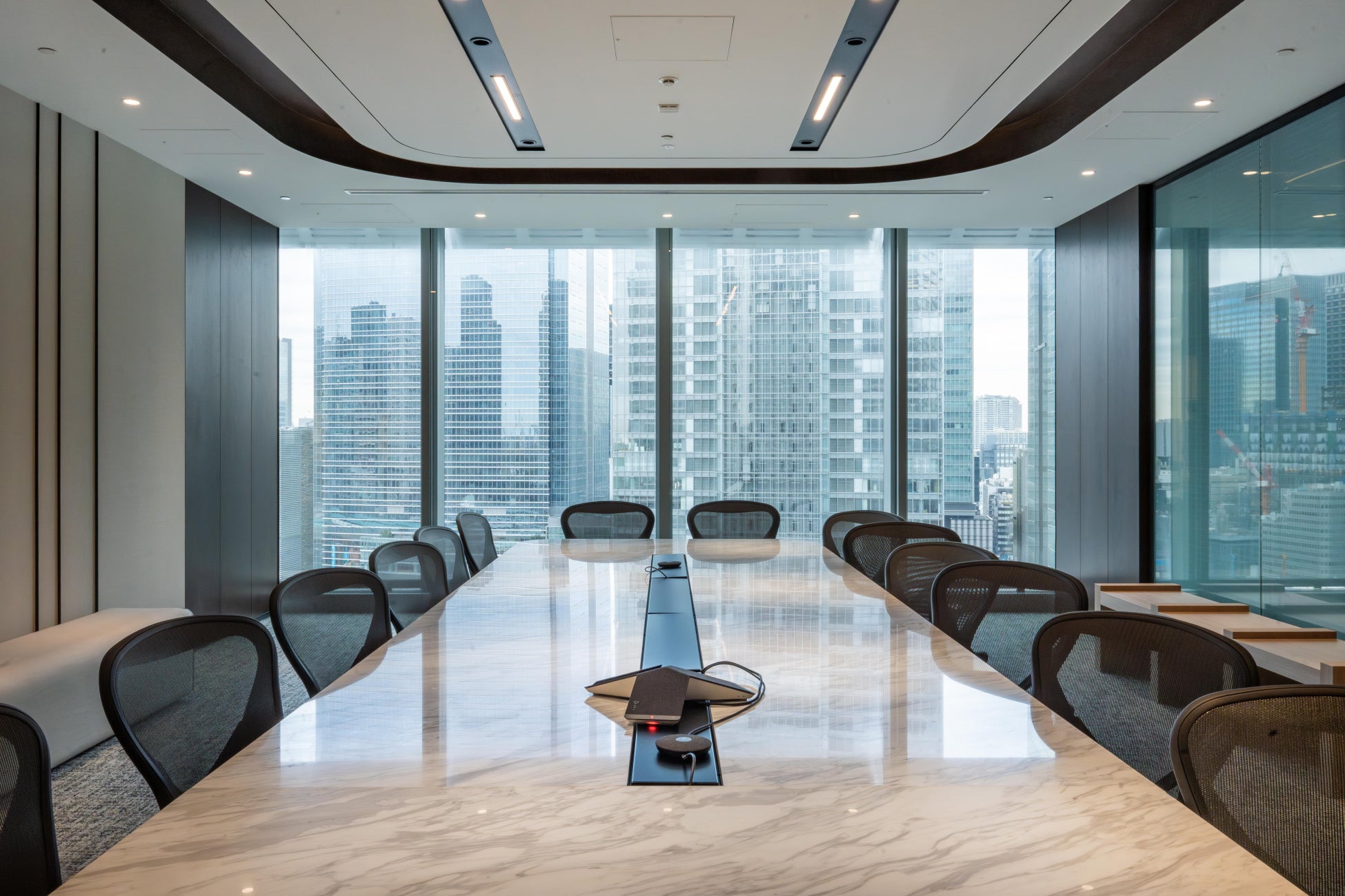 さらに、『JPタワー』センターには、14名様まで快適に利用できる広々とした役員会議室をはじめ、デザイン性に優れた会議室を用意しています。会議室はすべて、透明ガラスがすり調のガラスに一瞬で切り替えるマジックガラスや、最先端の設備が導入されており、プレゼンテーションや大切な会議の際にプライバシーと利便性を確保します。