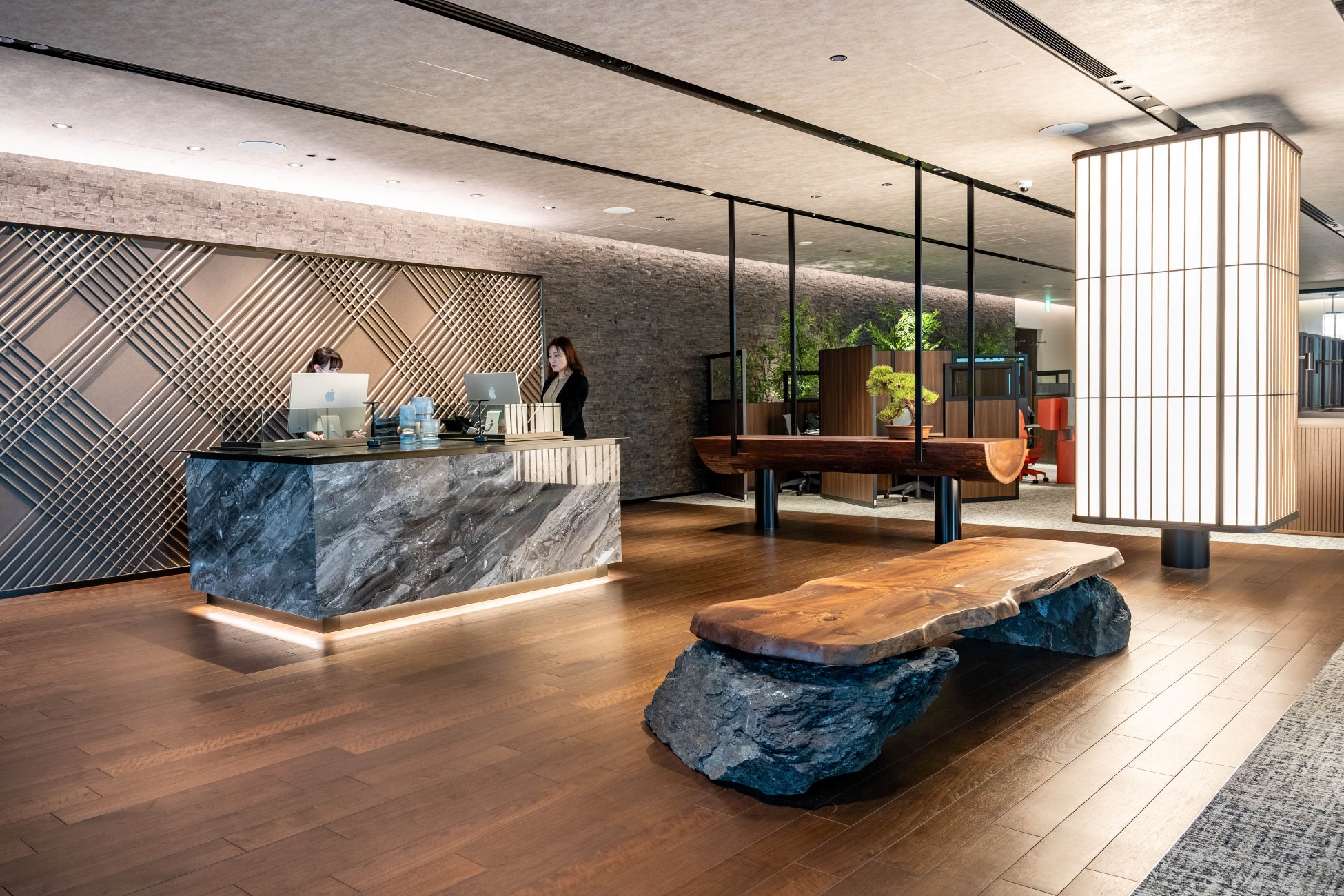 ラウンジエリアに隣接したコワーキングスペースは、集中して仕事ができる静かな環境を提供します。様々なワークスタイルに対応できるよう、個人席やボックス席など、多様なシーティングスタイルを用意し、配慮の行き届いたデザインとなります。木製インテリアや緑豊かな植物など、自然の美しさを取り入れることで、生産性を高めるストレスの少ない環境を作り出しています。