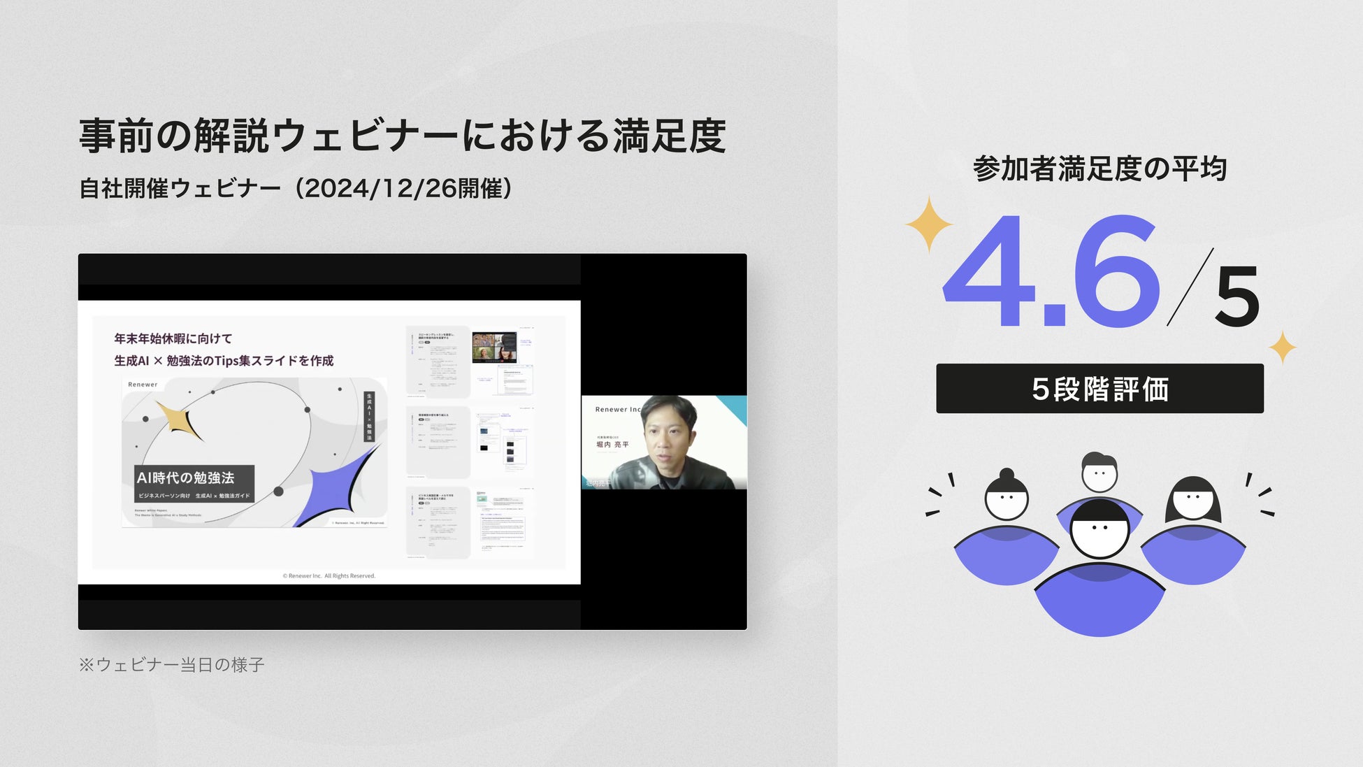 事前に本資料を抜粋して紹介した自社主催のウェビナーでは、参加者の満足度が5点満点中4.6点という高評価をいただき、生成AI活用に意欲的なビジネスパーソンから大変好評を得ました。