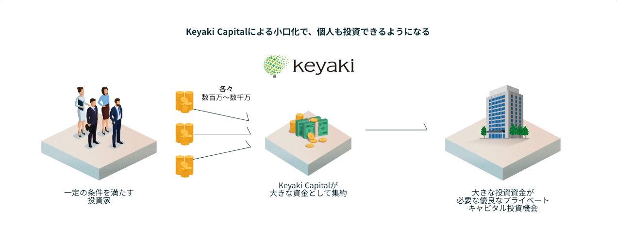 Keyaki Capital株式会社は、「充実感と高揚感に満ちた投資機会を」をテーマにこれまでプライベートアセットへ投資することのできなかった個人に対し、小口化によって投資機会を提供します。