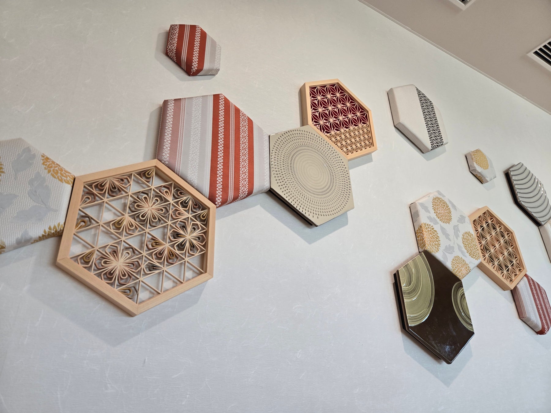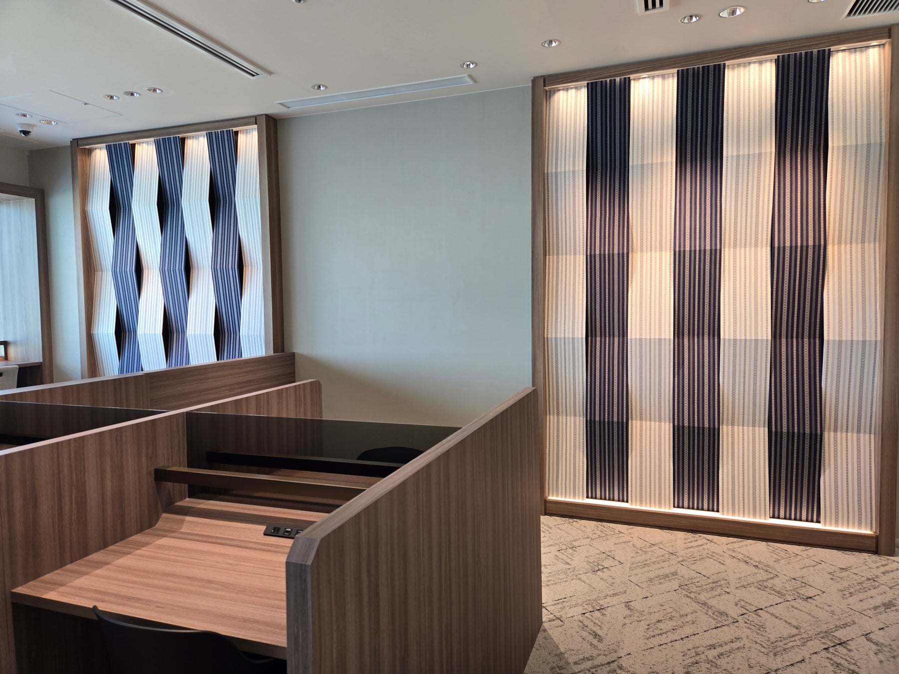 壁面に博多織、大川組子、小石原焼で制作した150~300角のパネルを設置。博多織については四季をイメージしたカラーや柄を用いて福岡らしさ・日本らしさを演出。