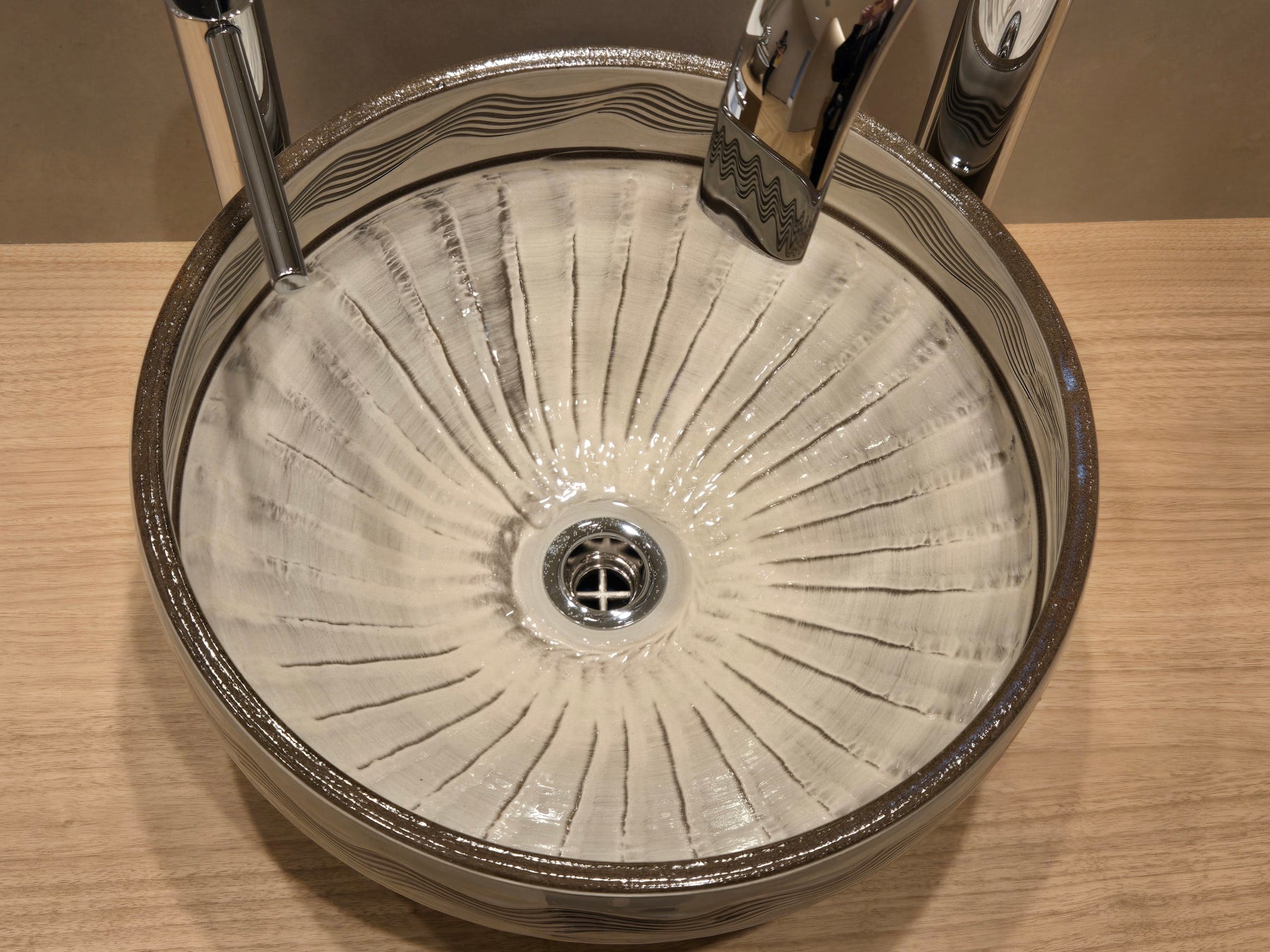 お手洗いの洗面ボウルに、福岡の代表的な陶器である小石原焼の器を採用。
