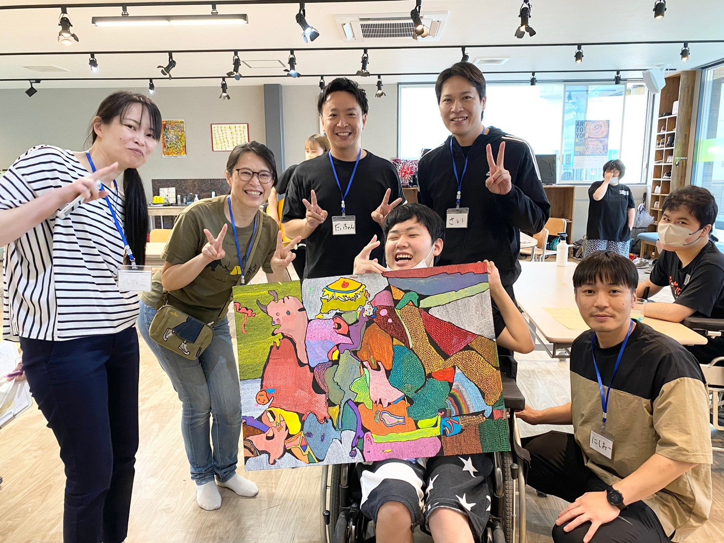 2020年からスタートした重度の身体障がい者によるアート活動。当初は「筆を持つことができない」「思うように描けない」といった課題があり、スタッフからも反発がありました。しかし、「彼らに仕事を作りたい」という想いで試行錯誤を続けた結果、現在ではアート展での受賞や、作品を使ったグッズ制作も進んでいます。