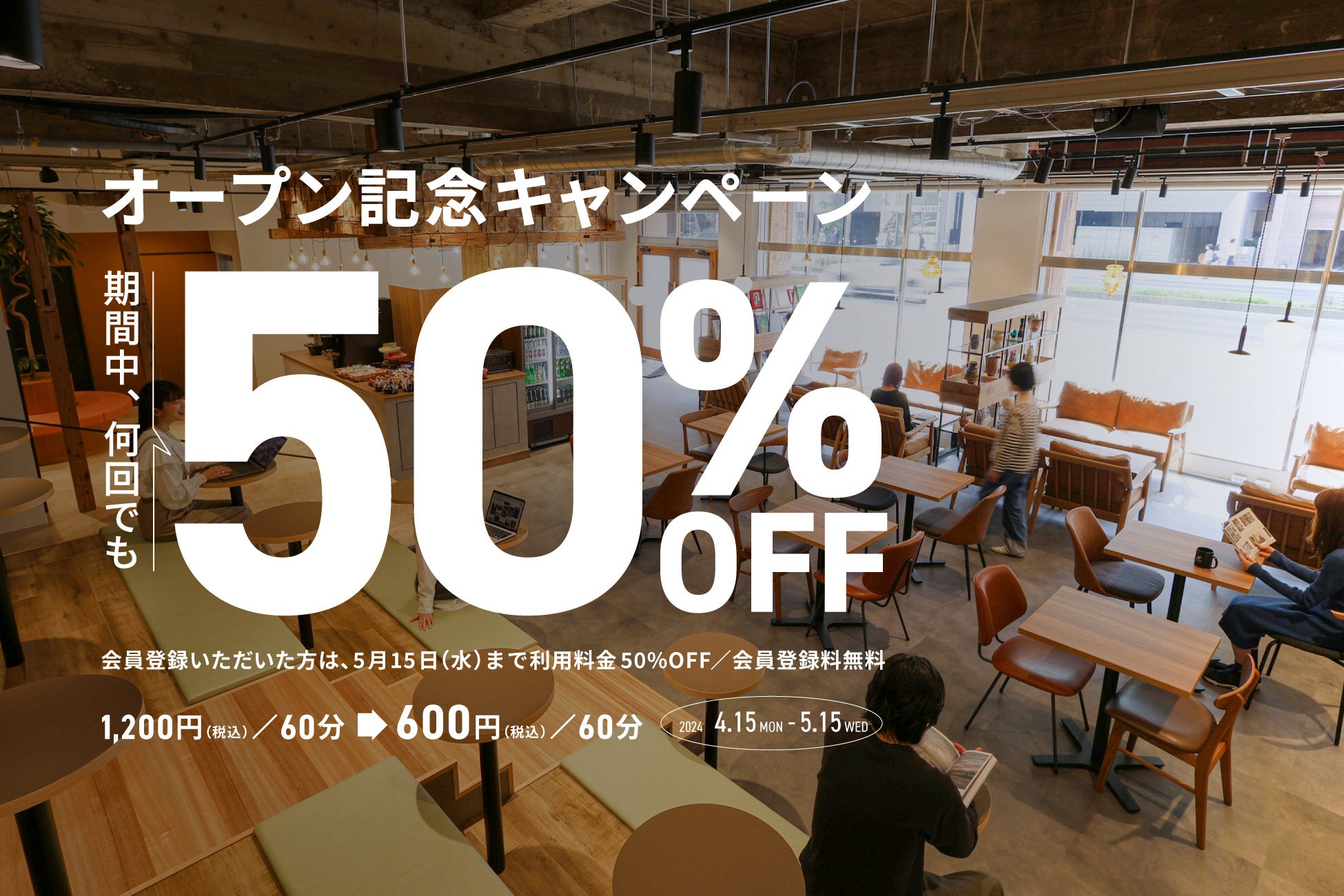 グランドオープンを記念し、利用料金が50%OFFになるキャンペーンを行います。4月15日(月)〜5月15日(水)の期間中何回でもご利用可能です。1,200円/60分のところ、600円/60分となります。