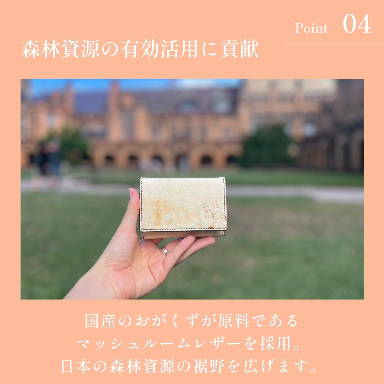 2023年に参加した経産省の主催する新規事業プログラム参画中に、マッシュルームレザー(きのこレザー)と出会い、原料としておがくずが使われていることから日本の木材資源の裾野を広げることに繋がるのではと思い、国内初のマッシュルームレザー特化型ブランドを立ち上げました。