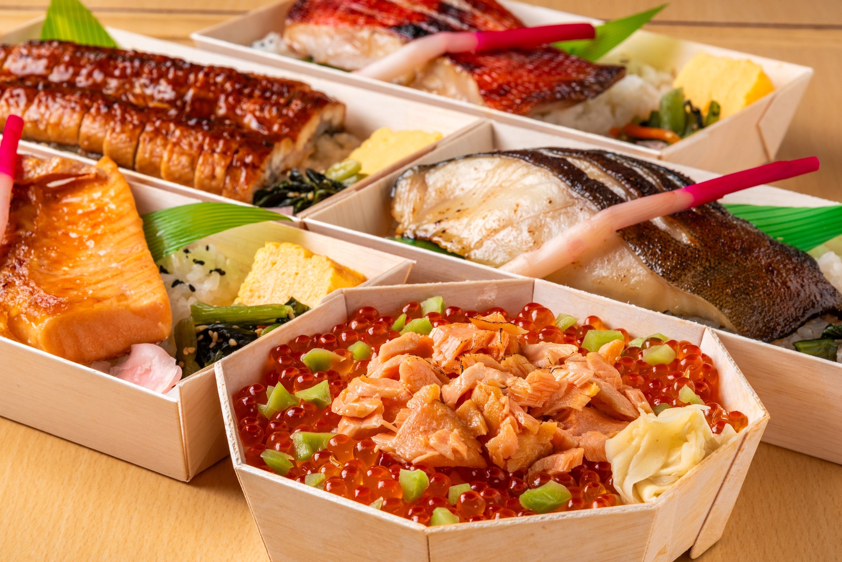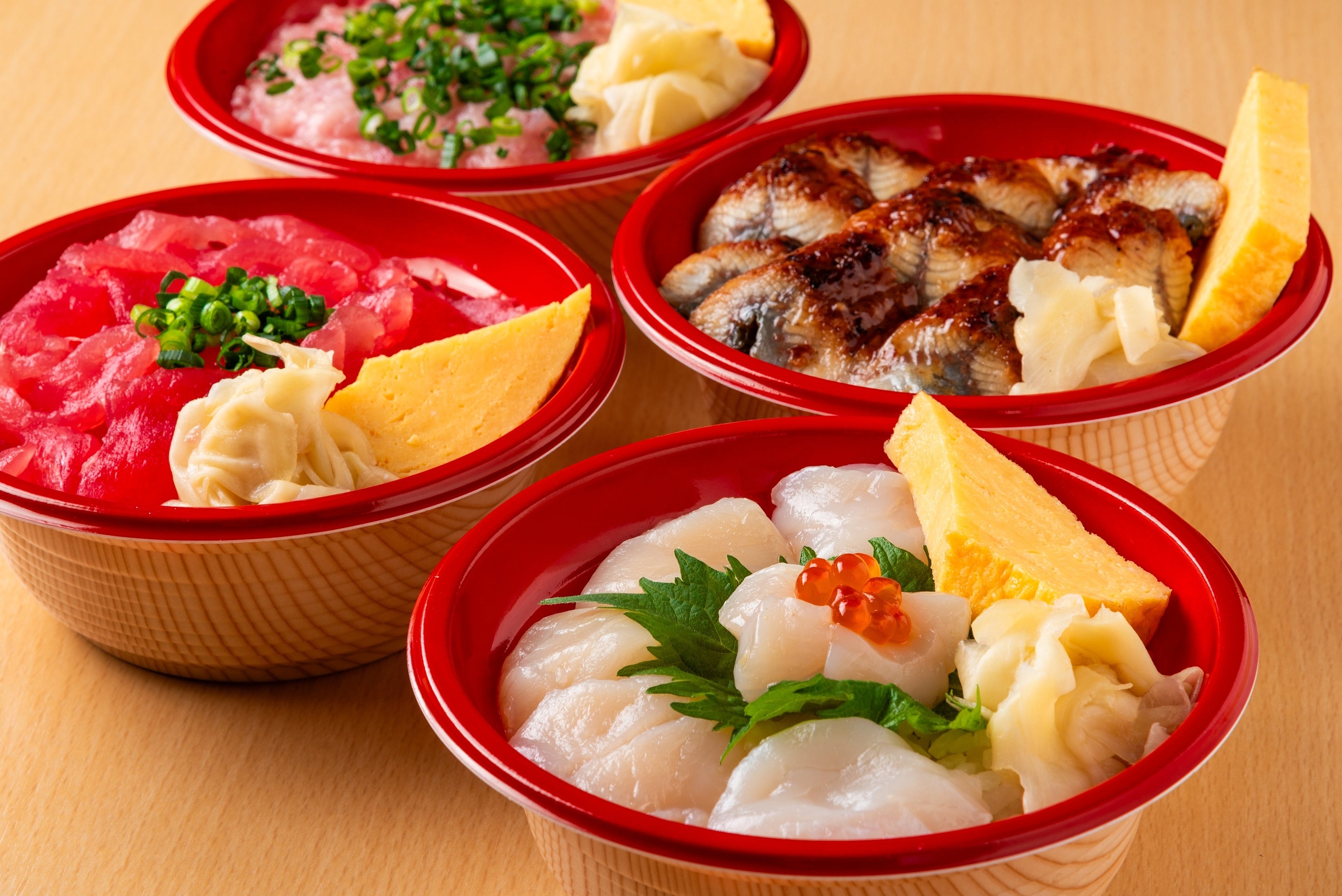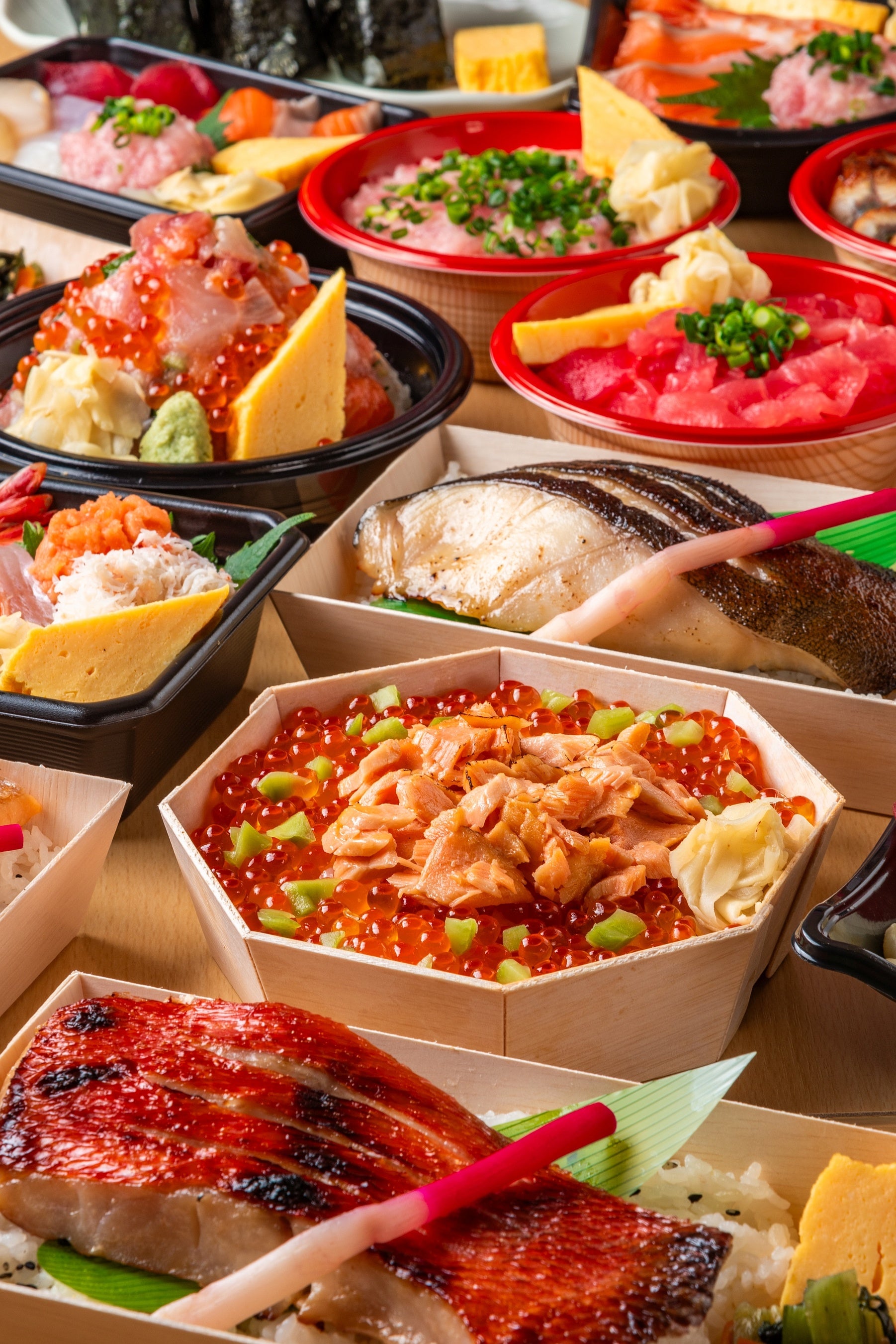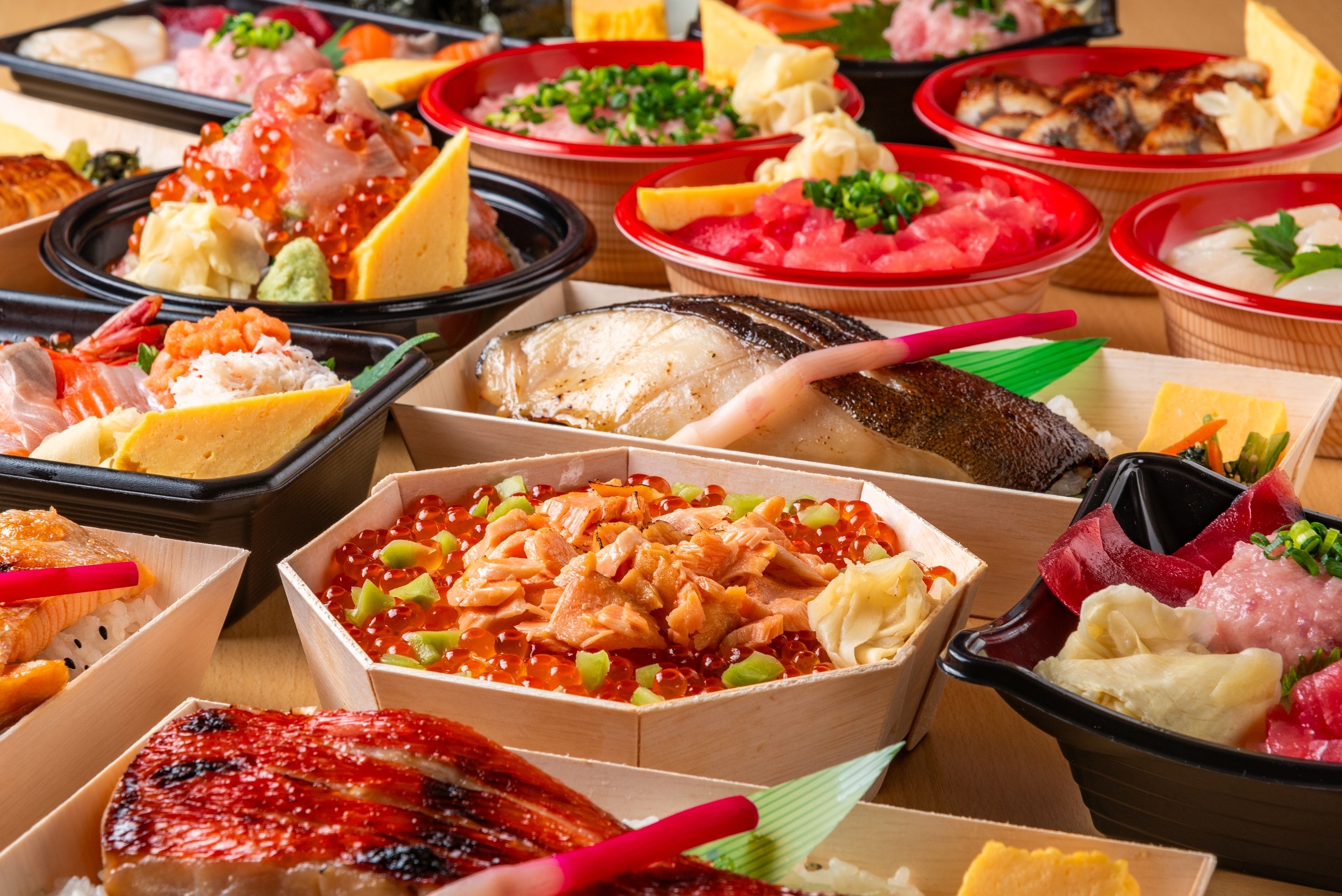 この度の東京駅催事への出店では、本店の看板メニュー「頂(ちょう) いただき丼」はもちろん、「エキュート東京店」限定の商品や姉妹店「魚がし料理 粋のや」の定食をアレンジしたお弁当など、バラエティ豊かなラインナップをご用意しております。豊洲市場直送のまぐろや魚介類をふんだんに使った海鮮丼や弁当を店内厨房でお作りし、出来たてを販売いたします。