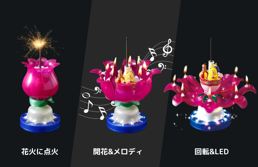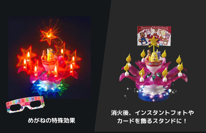 「スーパードリームキャンドル」の使い方は、まずキャンドルの中央にある花火に点火します。花火が花の中心に向かってパチパチと移動し、中心に到達すると花が開きハッピーバースデーの曲が流れます。開いたお花はくるくると回転し、その動きに合わせるようにベース部分のLEDが7色に点滅。その様子を見るだけでも十分楽しんでいただけますが、付属の専用メガネをかけることで花火やLEDが星型に見える効果を楽しむことができ、パーティーの場が驚きと感動に包まれます。実際に、誕生日のサプライズとしてドリームキャンドルを使った消費者によるTikTokの動画が注目を集め、ご注文が殺到しました。