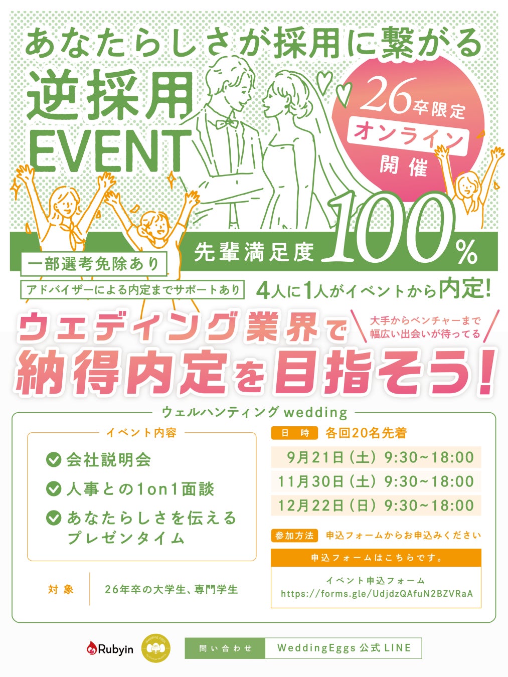【26卒採用強化中のブライダル企業必見】今秋冬、逆採用イベント「ウェルハンティングwedding」開催決定!