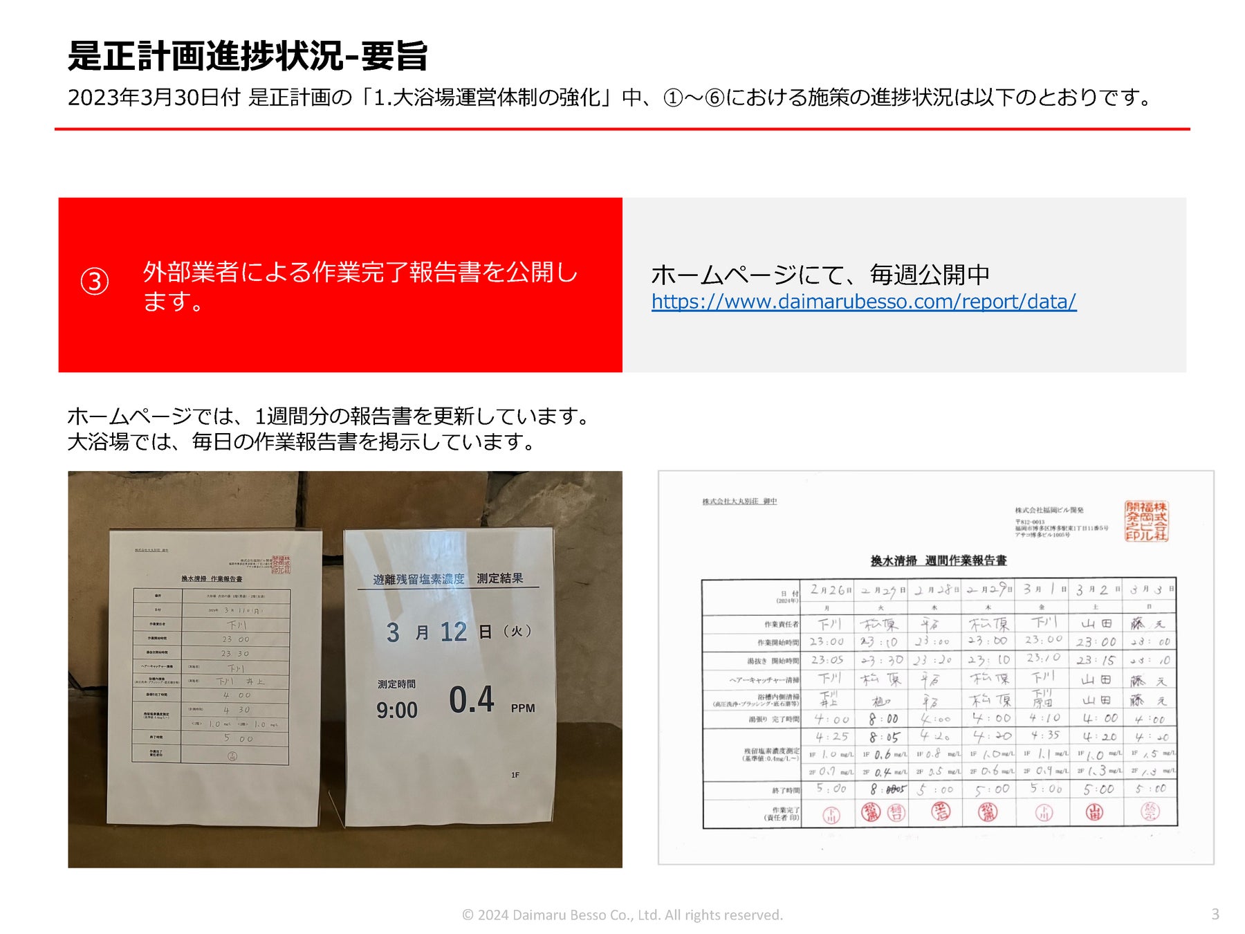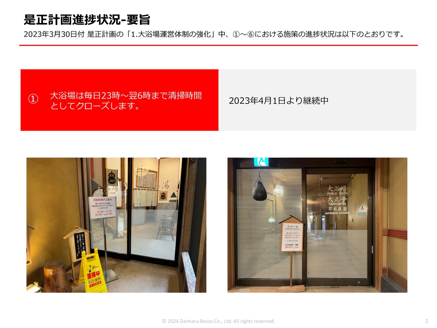 株式会社大丸別荘は、2023年3月30日付けの是正計画から約1年が経過したことを受けて、進捗報告を申し上げます。