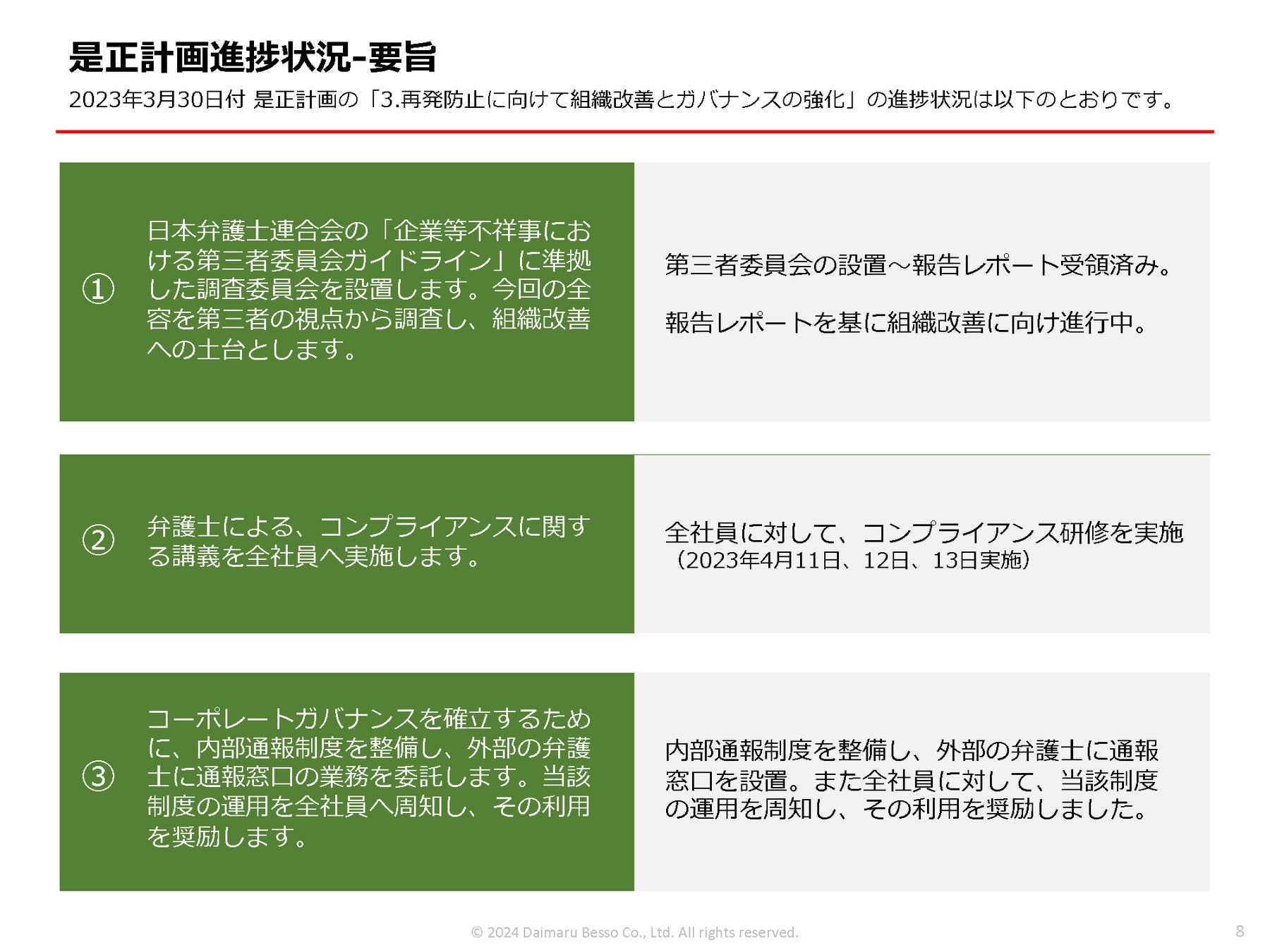この是正計画は、引き続き弊社の最重要課題と位置付け、全社員が一丸となって取り組んでまいります。今後とも変わらぬご支援とご愛顧を賜りますようお願い申し上げます。