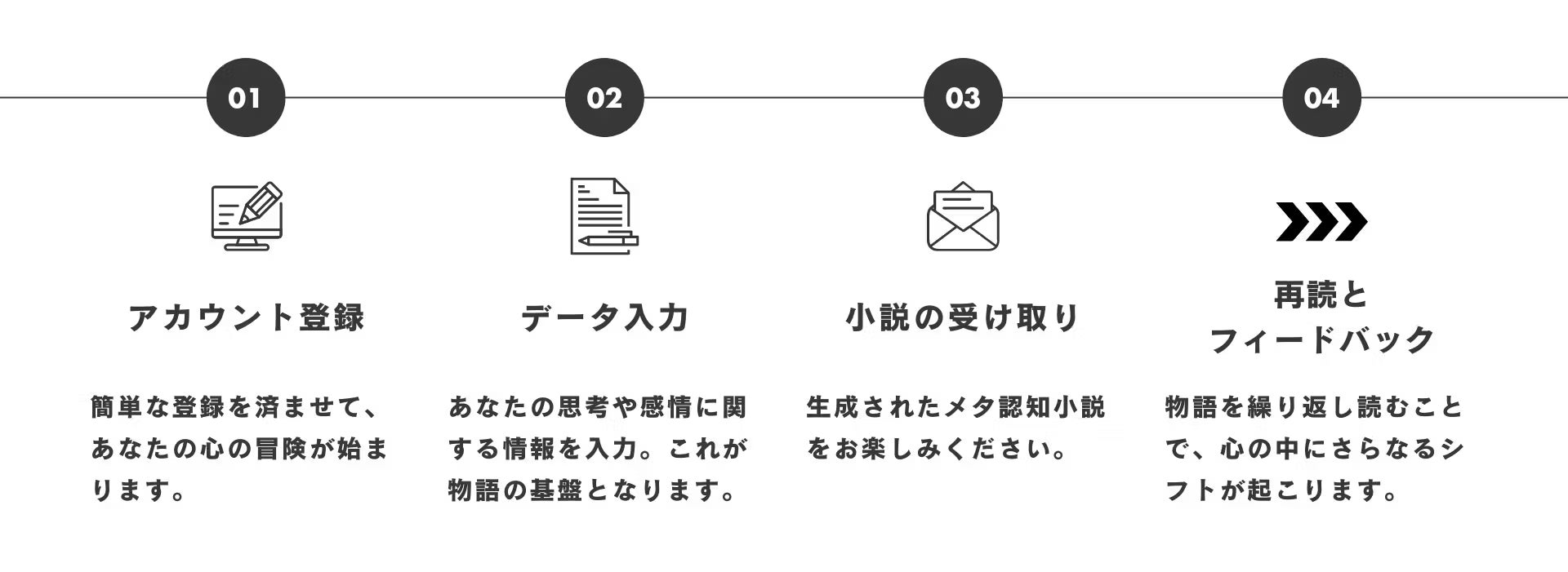 ユーザーが提供するパーソナル情報を元に、生成AIと小説家の共創で、あなただけの『メタ認知小説』を創り上げます。この小説は、現実のあなたが抱える問題や感情を、もう一つの視点から見つめ直すための『鏡』の役割を担い、心のシフトを促します。そして物語にリンクした音楽プレイリストが、感情をさらに深め、体験をより豊かに彩っていきます。