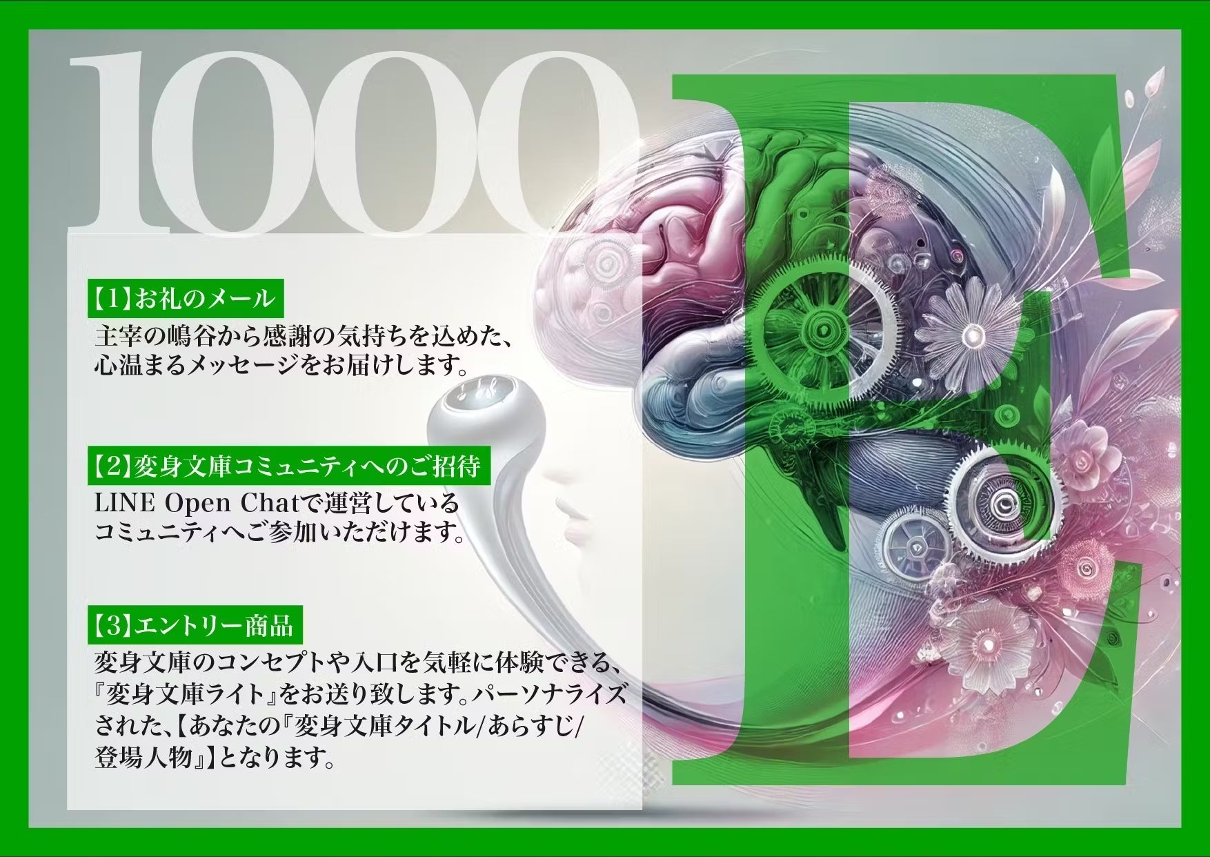これは、心の奥にある『生きづらさ』と向き合う力を育むことです。捨てることもリセットすることもできない、そんな感情に寄り添いながら、心のシフトをサポートする。変身文庫は、物語を通じて、あなた自身が持つ可能性に出会う旅へと導きます。