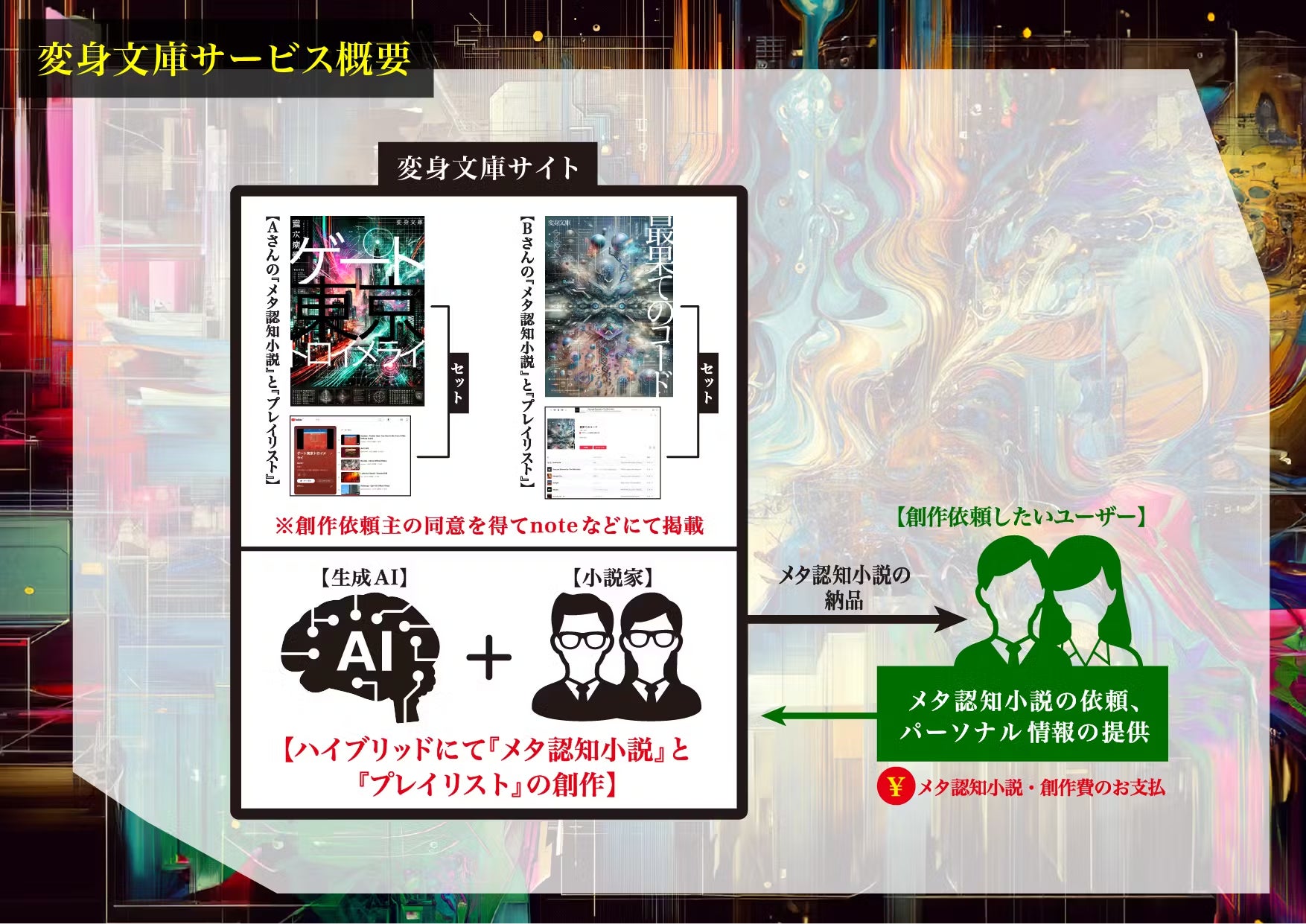 変身文庫は、生成AIと人間の小説家が共創する手法で、ユーザー毎にカスタマイズされた『メタ認知小説』をご提供します。メタ認知小説は『鏡』として、現実のあなたが抱える問題や感情を、別の視点から見つめ直す切っ掛けです。また各小説には、リンクした『専用の音楽プレイリスト』が用意され、より没入感を高めます。