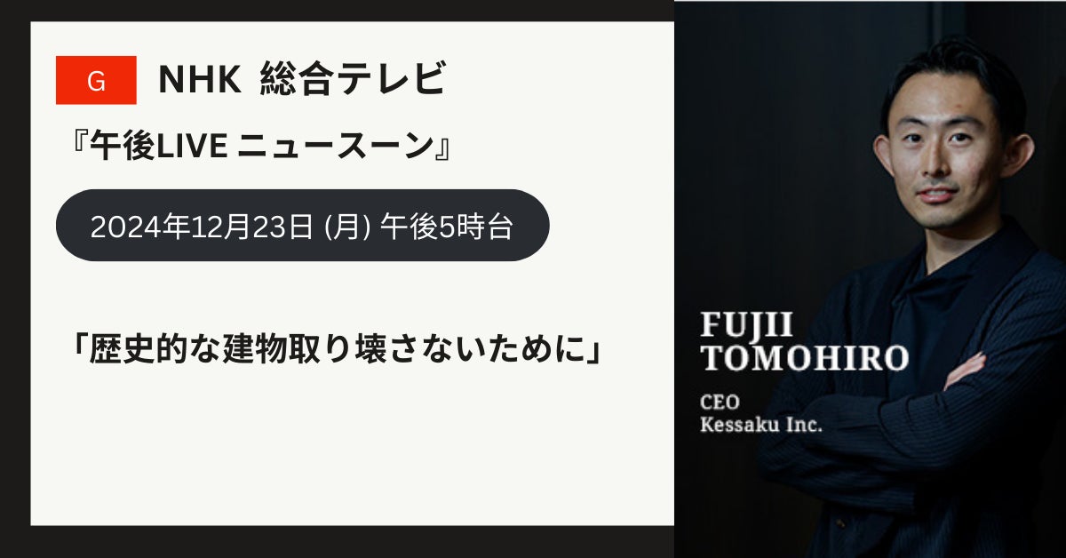 毎年1日分単位で名建築のオーナーなれる共同継承会員権を発行する 株式会社kessaku(本社:東京都渋谷区、代表取締役:藤井 智大)は、本日2024年12月23日(月)午後17時台に全国放映で、NHK総合テレビの『午後ライブ ニュースーン』特集コーナー「トクシューン」に出演することをお知らせいたします。歴史的な建物を取り壊さないために、直面する課題、活用の例などを紹介する一環で、名建築の保存と活用に取り組むKessakuの共同オーナープロジェクトやその背景、今後の展望について紹介されます。放送では、代表取締役CEOの藤井智大が登場し、矢掛での事例に加え、今後の展望について語ります。