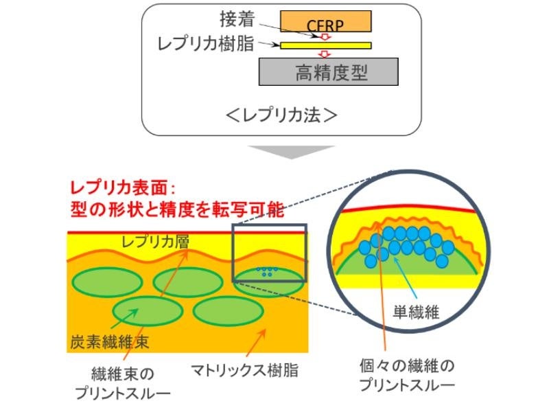 液晶ディスプレイ(LCD)製造装置におけるバーミラーの軽量化に向けて、熱膨張率が小さく軽量であるというCFRP(炭素繊維強化樹脂)の特徴を生かした、CFRP製ミラーの実現が望まれてきた。そのためには、炭素繊維や繊維束に起因してCFRP表面に凹凸が生ずるプリントスルー(繊維模様が表面に表れる現象)と、大型化に伴って影響が大きくなる全体的なたわみを解決する必要がありました。