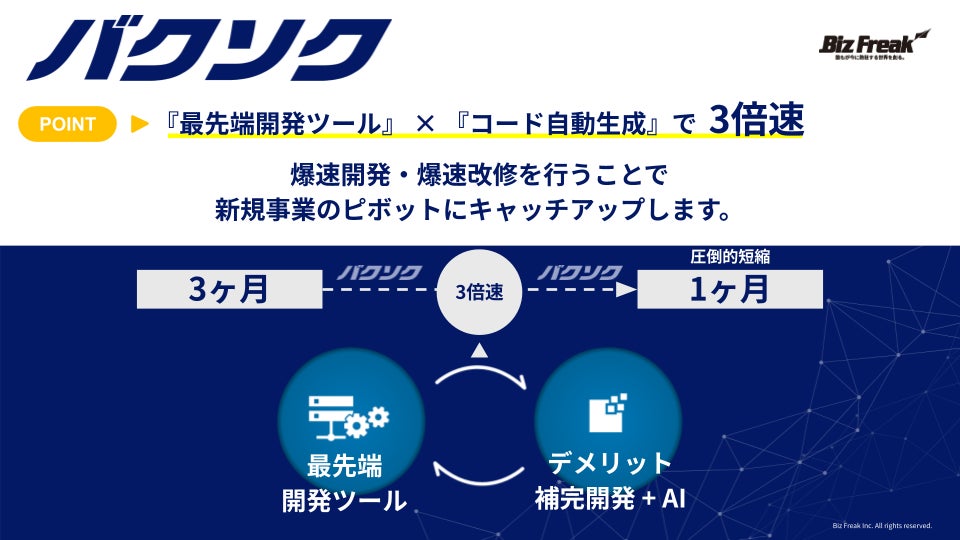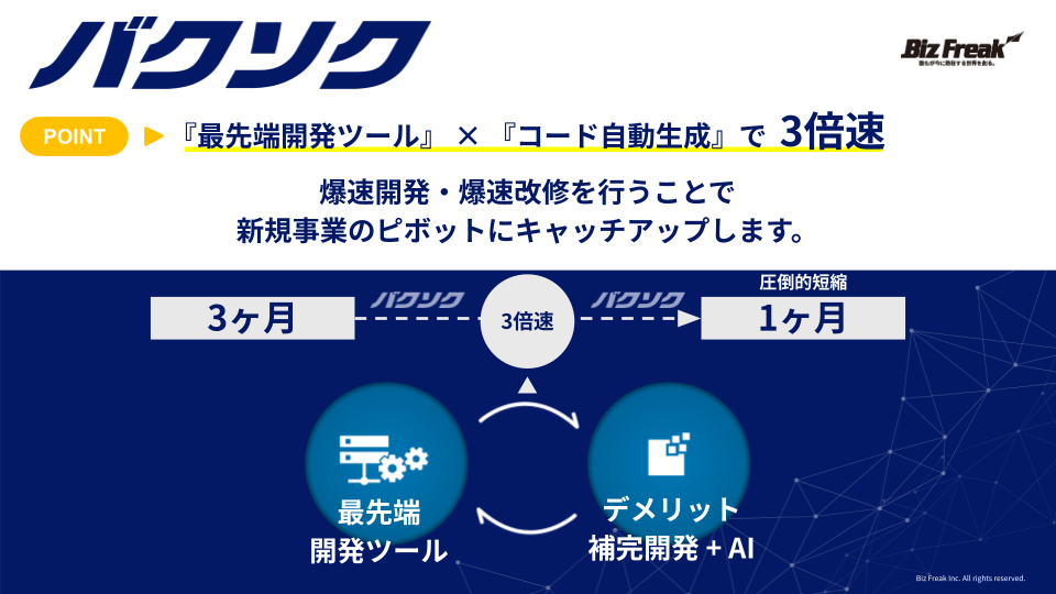 株式会社Biz Freakは、「日本を最高のイノベーション大国にする」というミッションを掲げ、AIやノーコード技術を活用したサービス開発を行っています。私たちは、従来の常識にとらわれず、常に新しい技術に挑戦し続けることで、顧客のビジネス成長に貢献しています。具体的には、AI・最先端ツールを駆使したアジャイル開発の手法を取り入れ、迅速かつ柔軟に対応できる開発プロセスを構築しています。これにより、顧客の多様なニーズに応えながら、高品質なサービスを迅速に提供することが可能となっています。