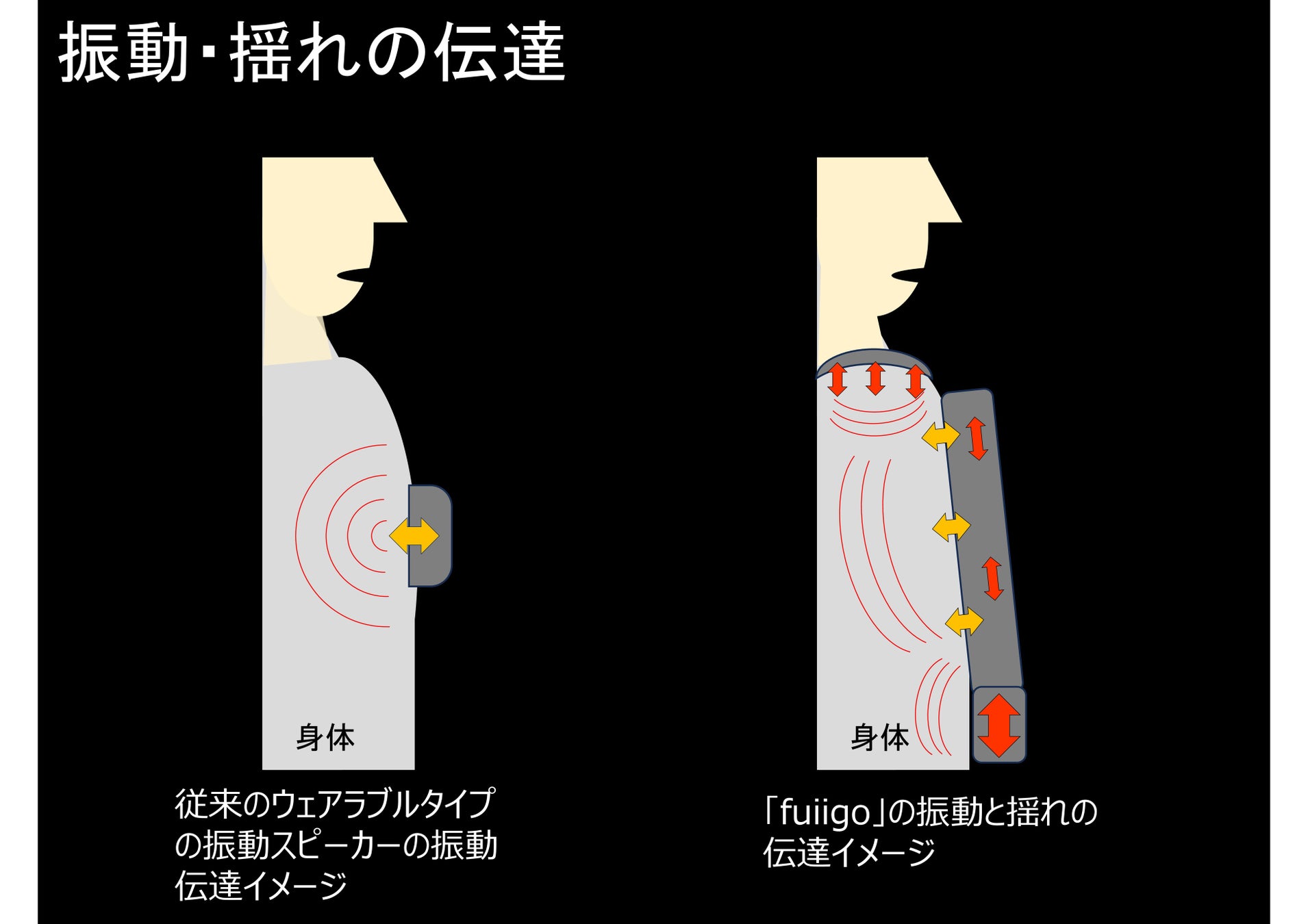 fuiigoを身に着けた時、左右の胸からお腹にかけて密着する筒状の部分には低音用のスピーカーが内蔵されており、低音とともに振動と揺れを発生します。