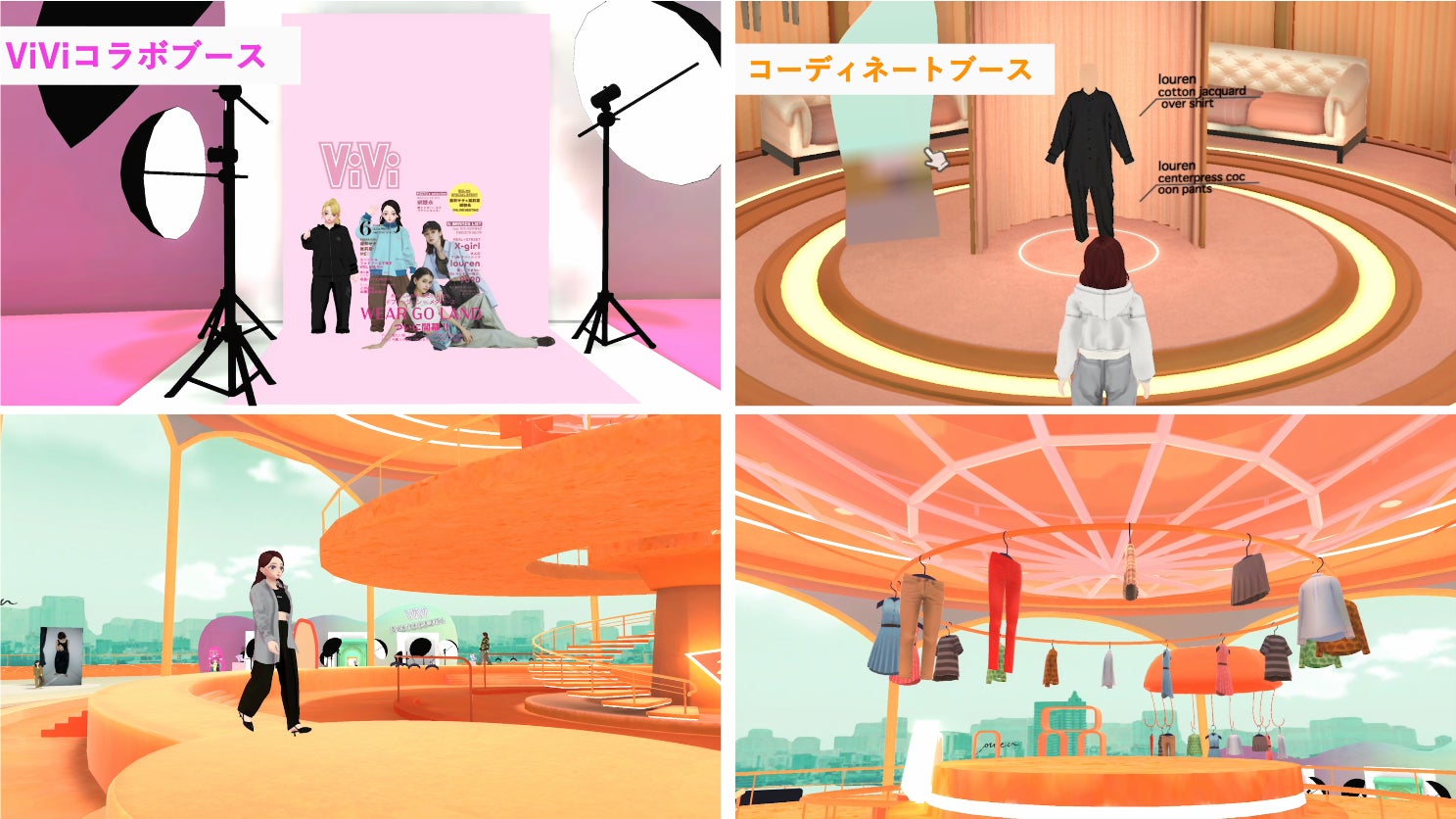 4月6日(土)、13日(土)には、20代女性を中心に人気を誇る女性ファッションメディア「ViVi」とのコラボイベントも決定しました。ランウェイエリアでは、2024年5月号をもってViViモデルを卒業する藤井サチさんと、現役ViViモデルの嵐莉菜さんがアバターになって登壇し、バーチャルファッションショーを開催します。利用者はアバターを通じて、ランウェイの周りで自由に鑑賞することができ、着用商品をオンラインショップにて購入することも可能です。
